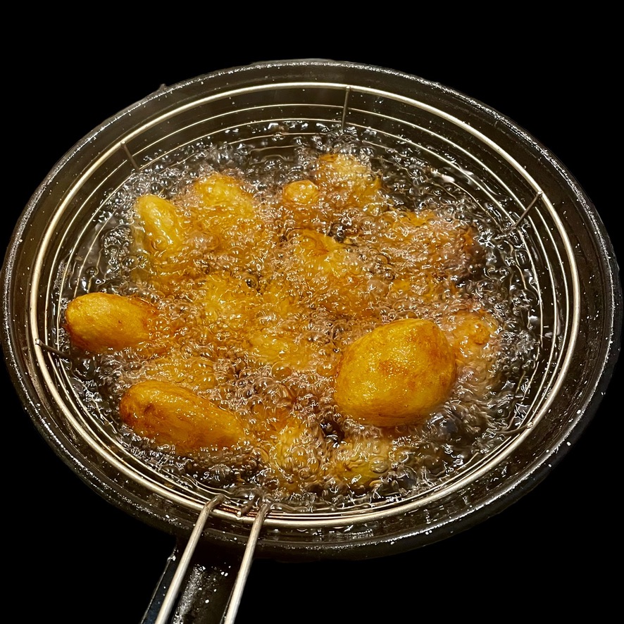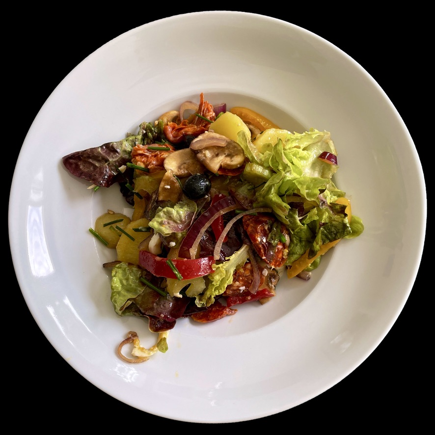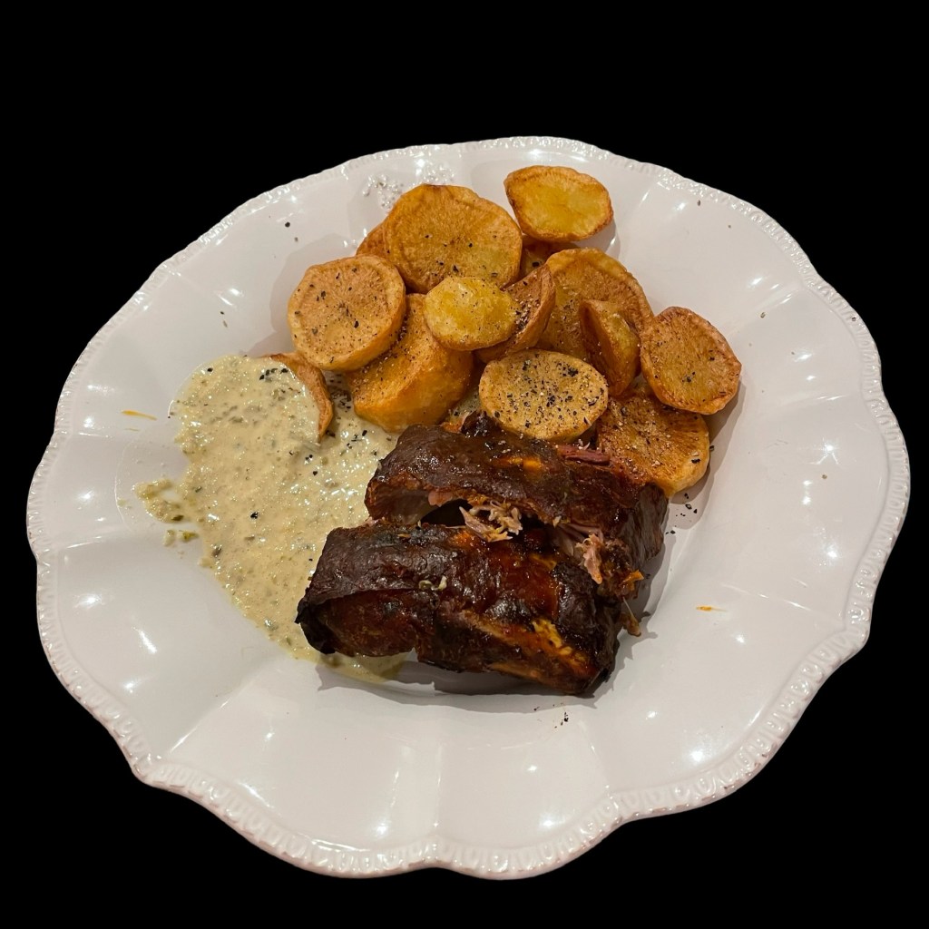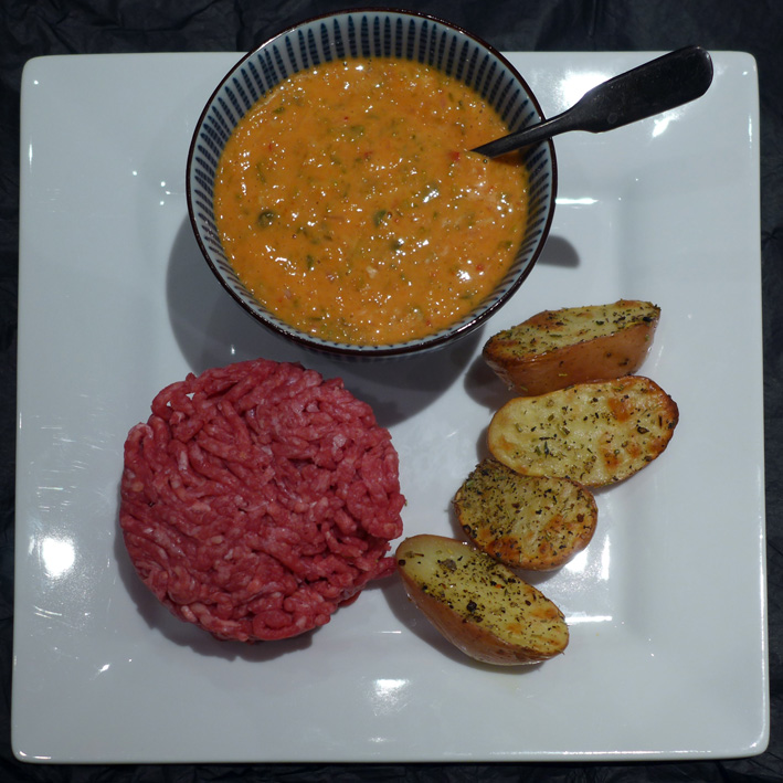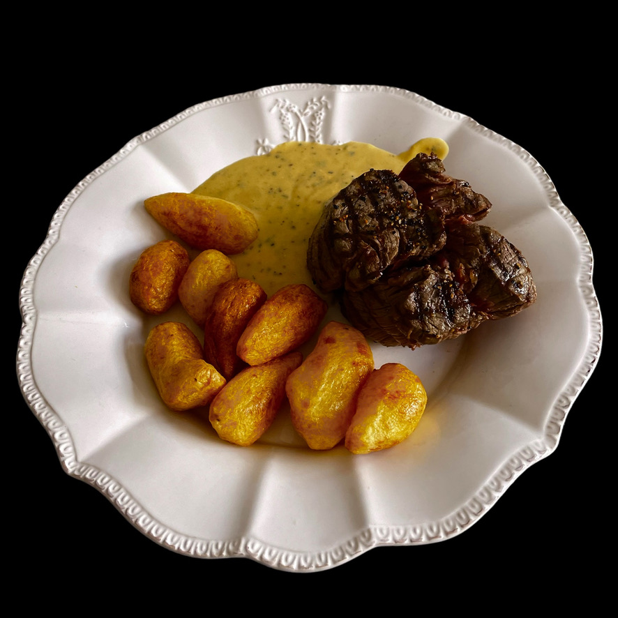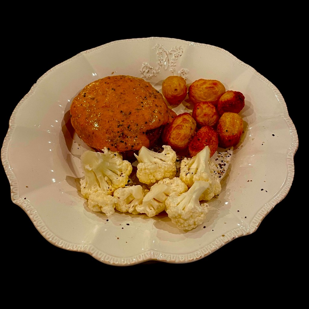 Vous épluchez des petites pommes de terre, vous les mélangez avec une cuiller d’huile et vous les cuisez à l’airfryer. Vous servez cela avec des têtes de choux fleur crues. (oui, oui, ça marche très bien !)