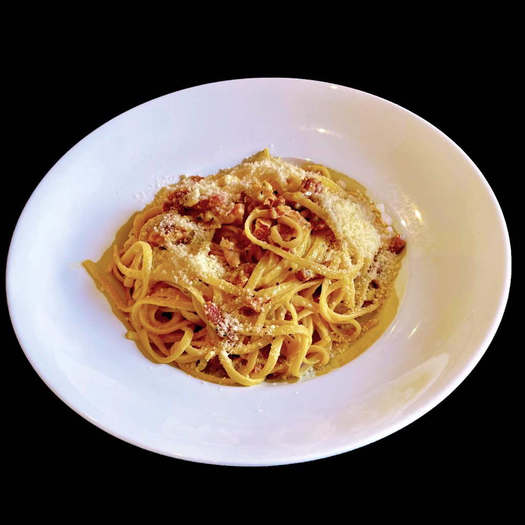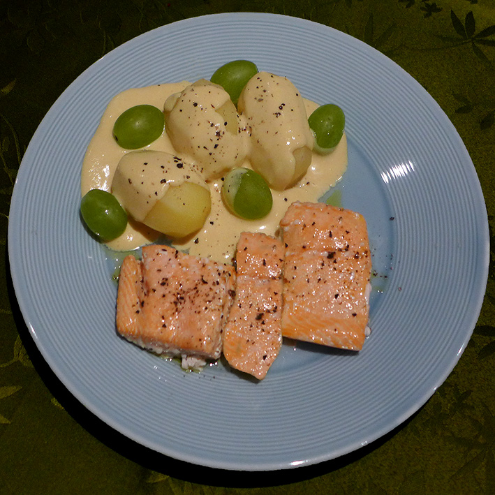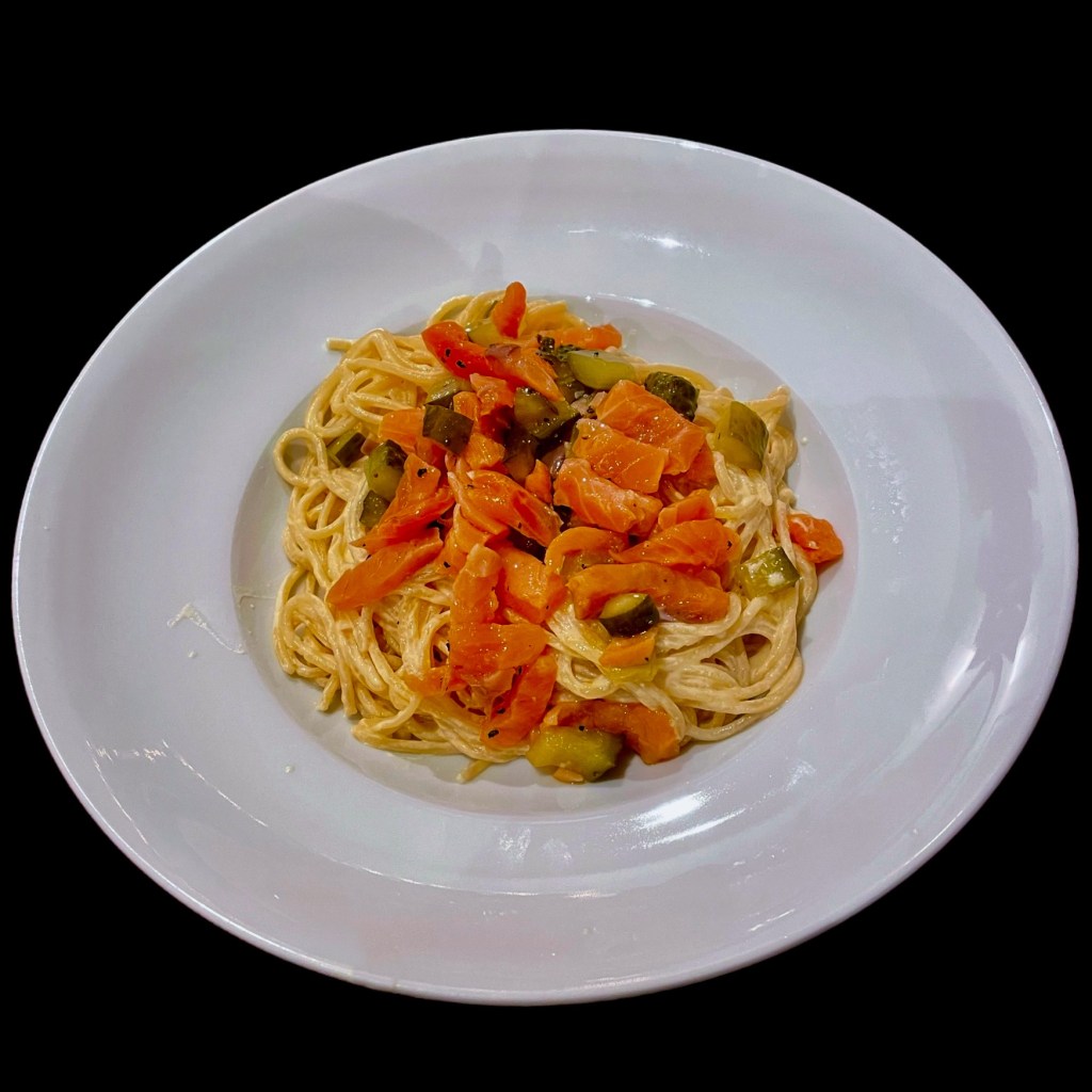 Nous servons dans des assiettes creuse, d’abord les linguine, puis la crème avec la ciboulette et, enfin le saumon et les oeufs de saumon. Tout est chaud, sauf le saumon. Il ne reste plus au gastronome qu’à mélanger et se régaler.