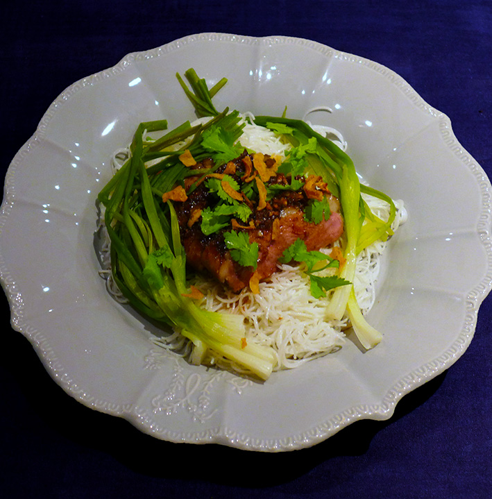 Des filets de poulet coupés en gros dés que l’on fait blanchir dans un bouillon et que l’on réserve dans du jus de citron et du piment. On utilise le bouillon encore chaud pour pocher des ciboulettes thaïes.