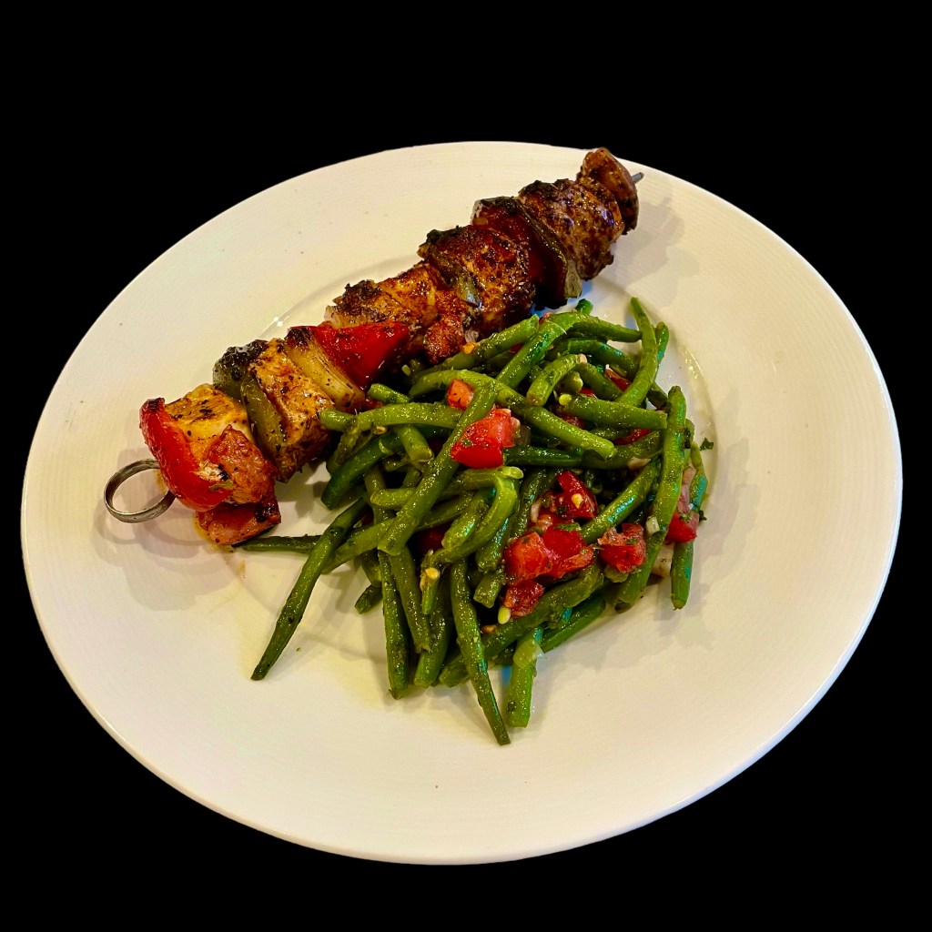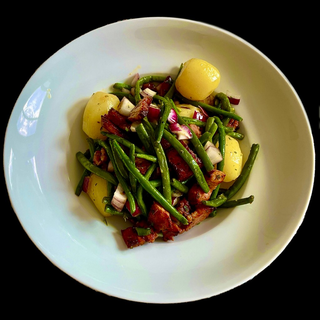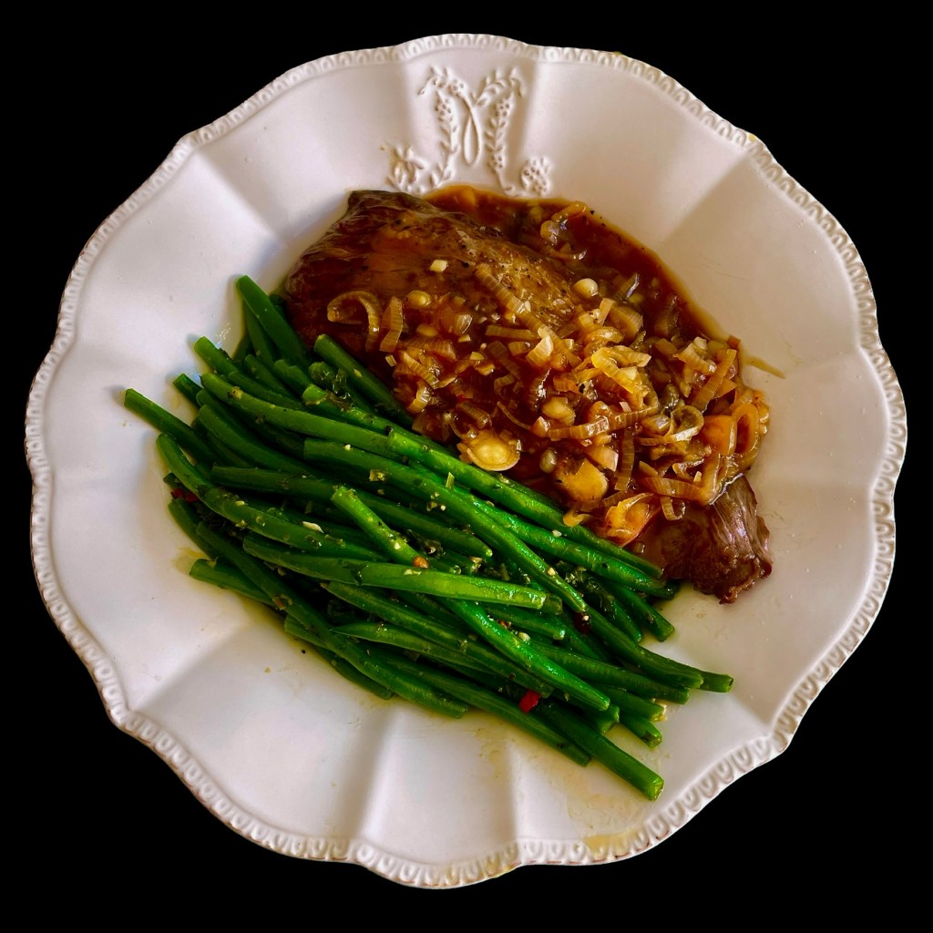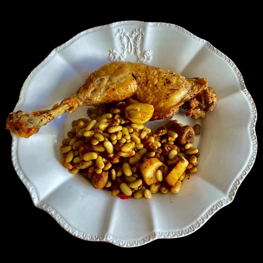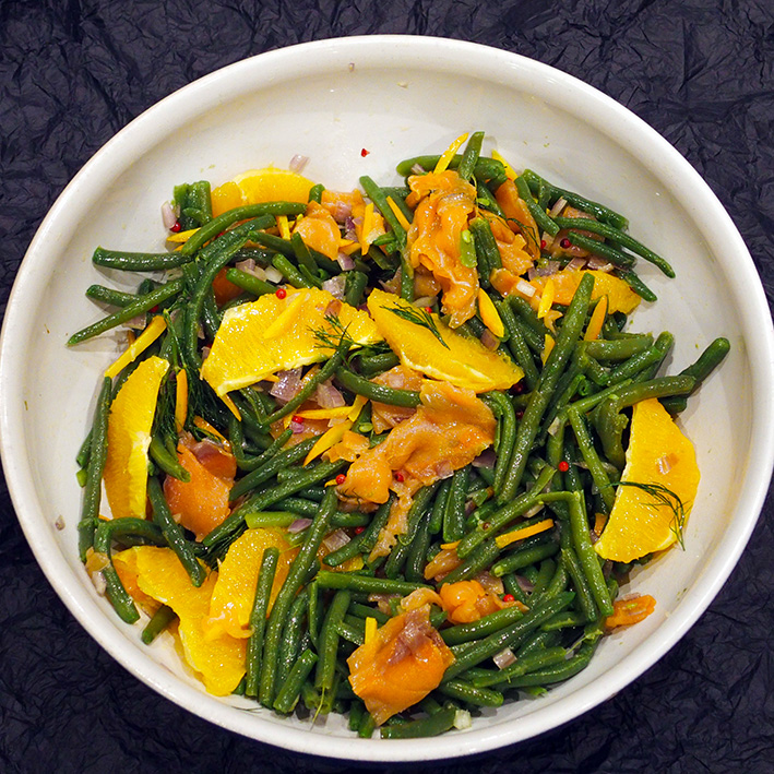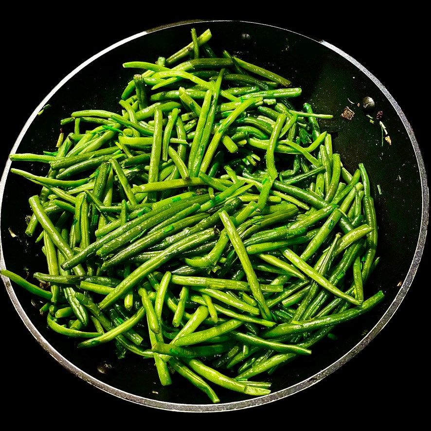Vous faites cuire des haricots verts extra-fins pendant 5 à 6 minutes dans de l’eau additionnée de sel et de bicarbonate de sodium. Ils doivent être bien verts et encore légèrement croquants. Vous les égouttez et les versez dans une grande poêle où a blanchi une échalote et une gousse d’ail. Vous y ajoutez des flageolets bien lavés et laissez mijoter.