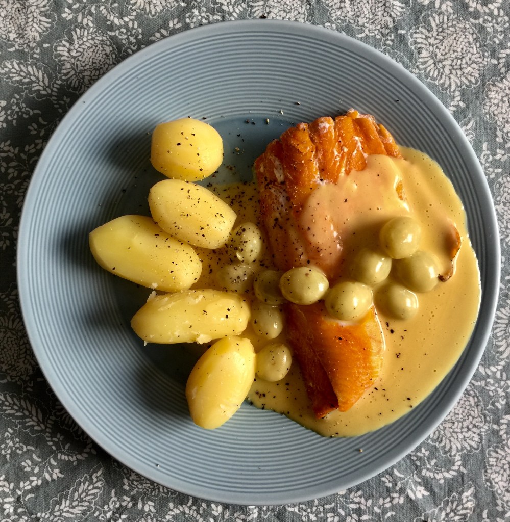 Dans une petite casserole, j’ai mis de la crème fraîche, du jus de citron et de la moutarde douce (Savora, moutarde suédoise à l’aneth). J’ai laissé réduire à feu doux.