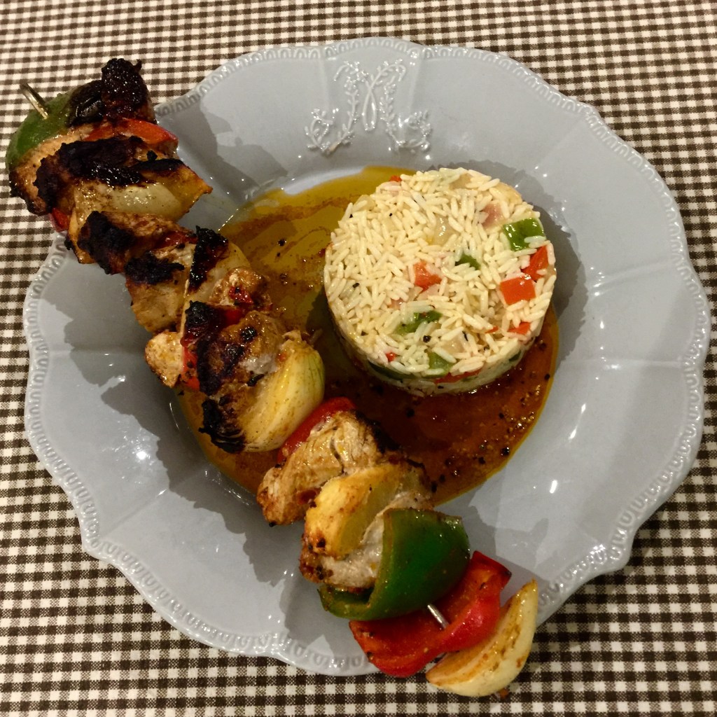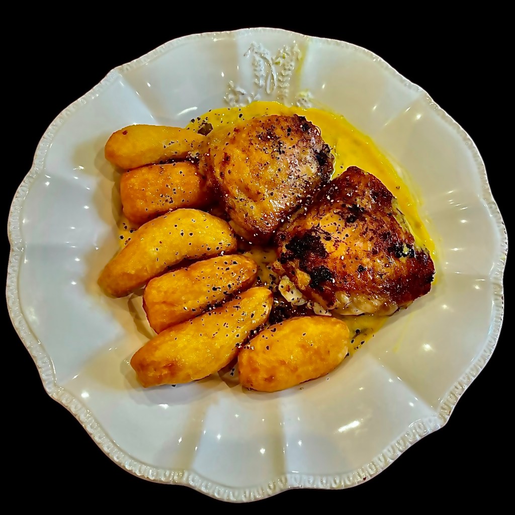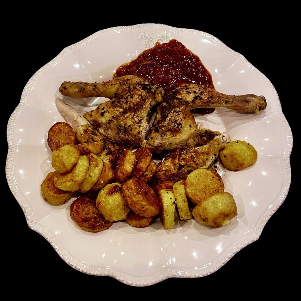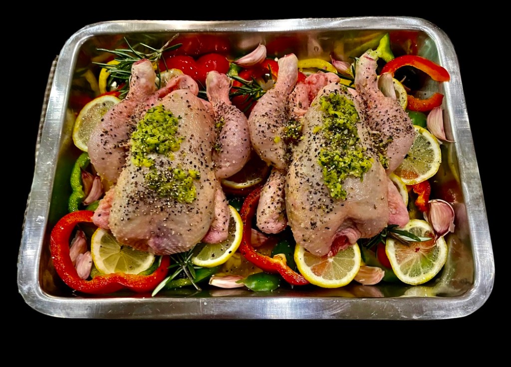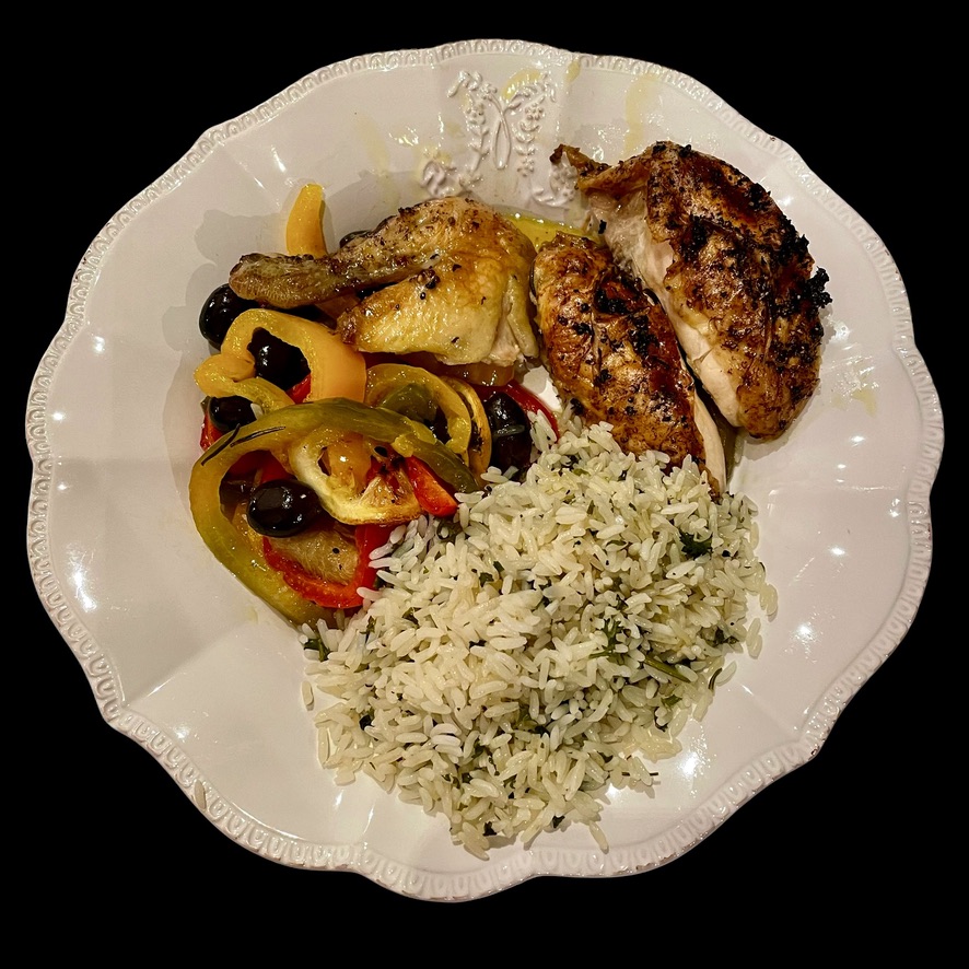 Alors là, tu prends des hauts de cuisses de poulet et tu les fait mariner dans un mélange d’huile d’olive, de jus de citron, de gros sel et de poivre concassé. Tu y ajoutes des poivrons longs coupés en rondelles fines. tu mélanges bien, tu t’arranges pour que les morceaux de viande aient la peau vers le haut, et tu mets au four, au milieu et sous un gril moyen. Ça doit cuire à coeur et la peau doit devenir croustillante.