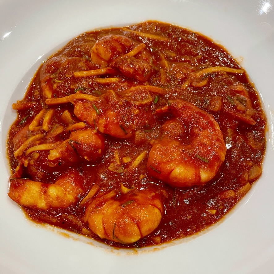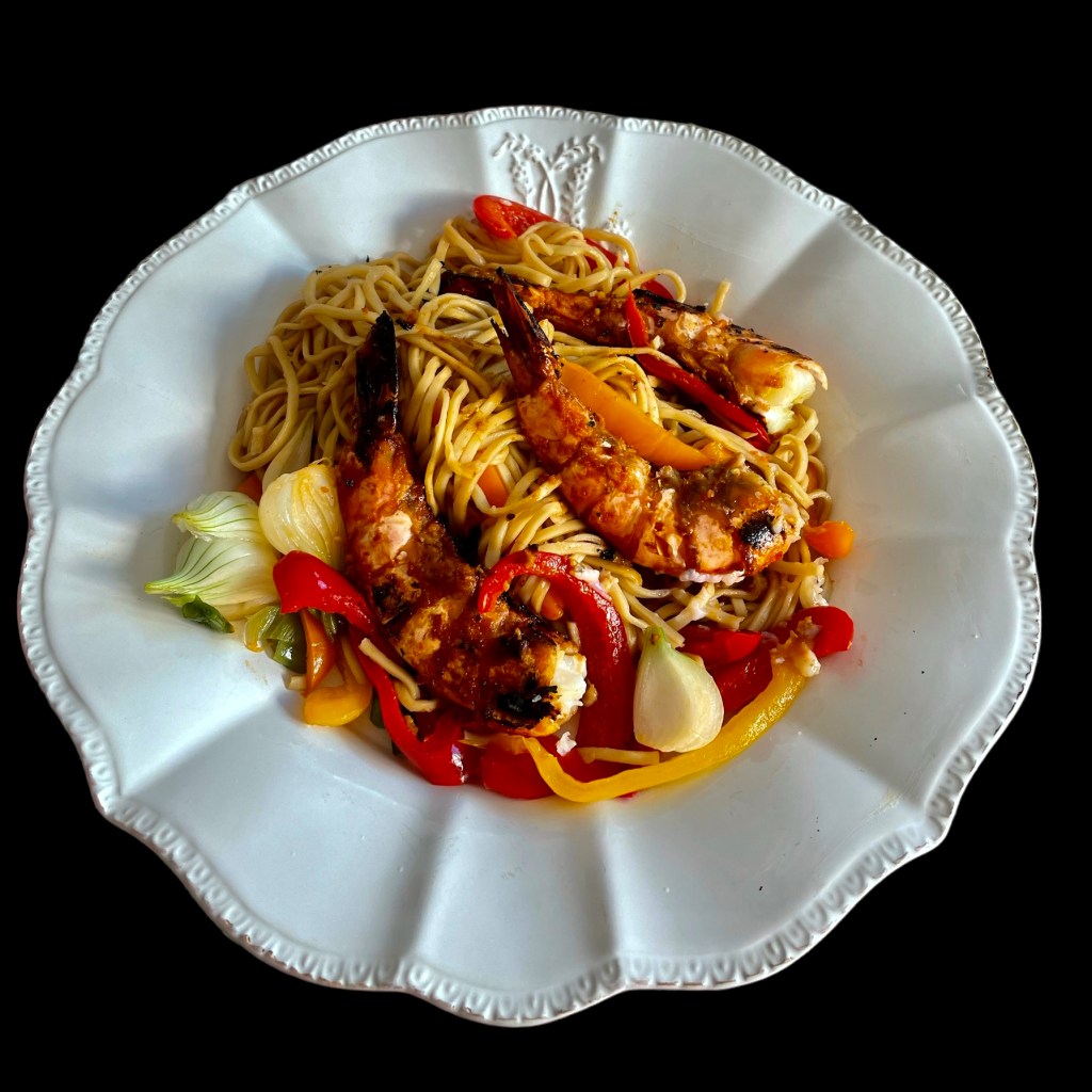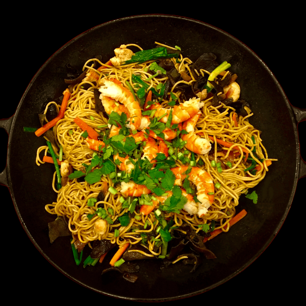 LES NOUILLES SAUTÉES AUX GROSSES CREVETTES