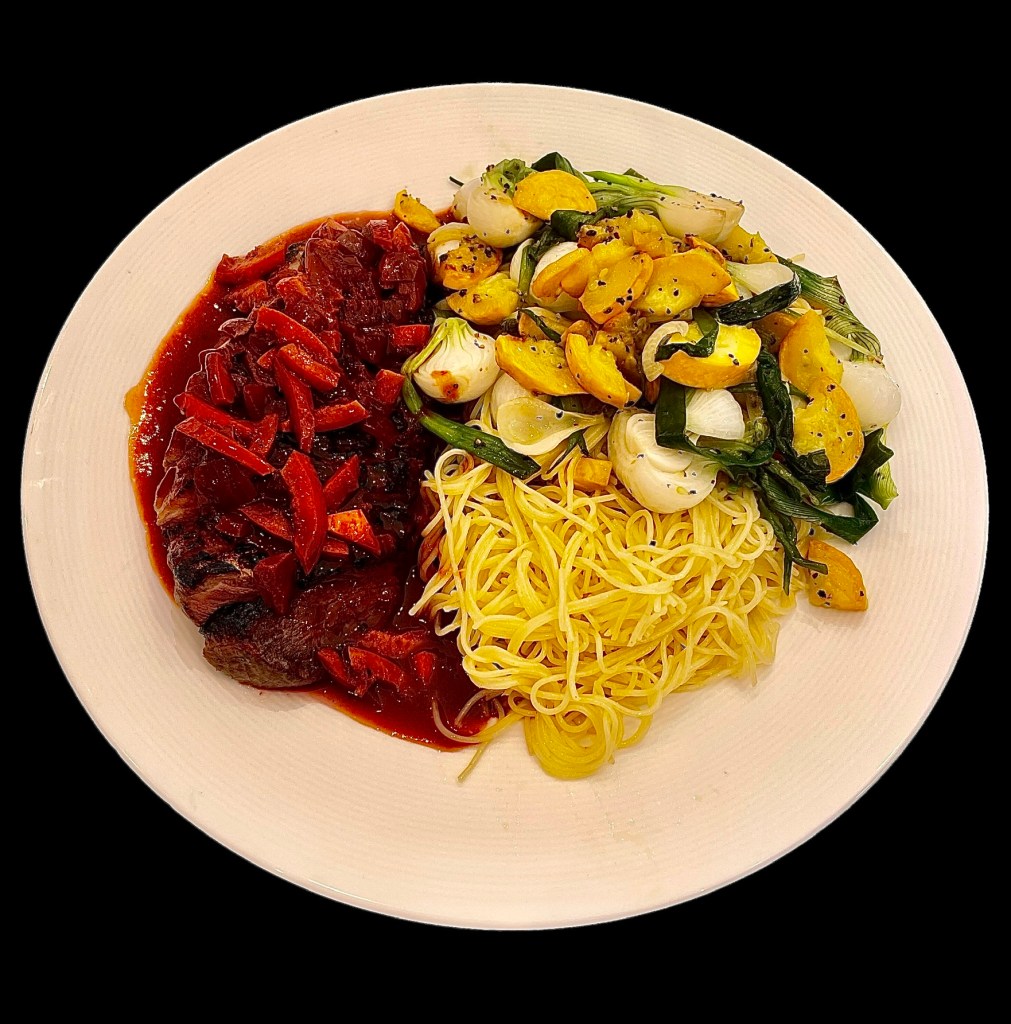 – Trois poivrons qui n’auraient pas passé la semaine, un rouge, un vert et un jaune. Je les ai épépinés, j’ai ôté tout le blanc, je les ai coupés en dés et ajoutés dans le wok.