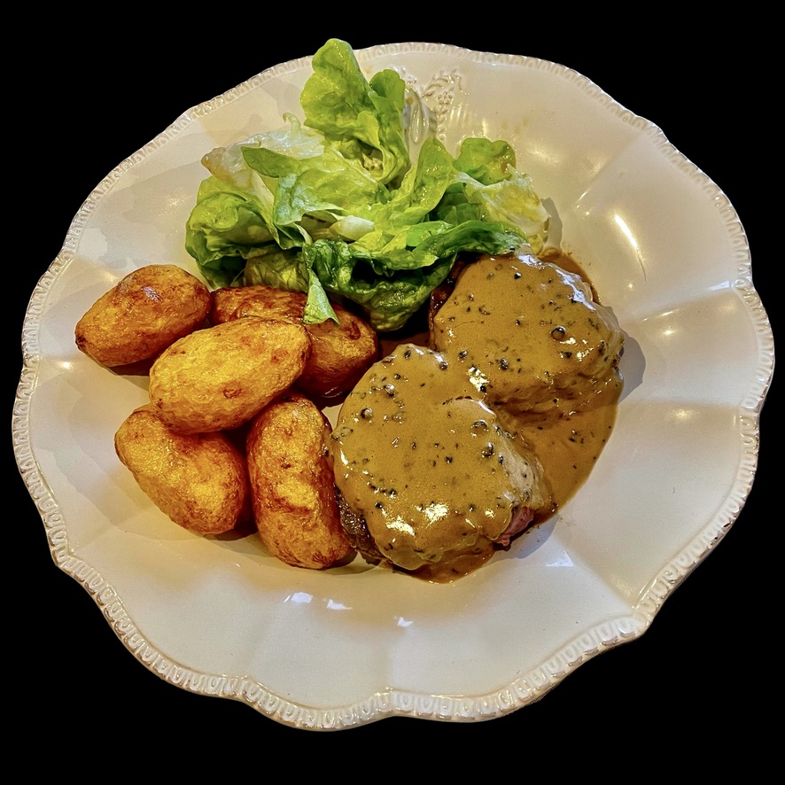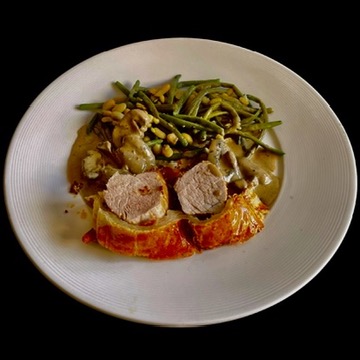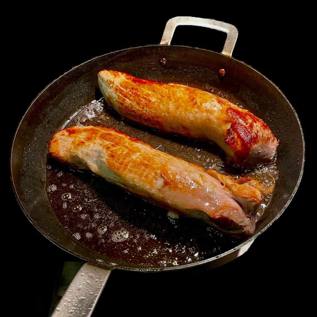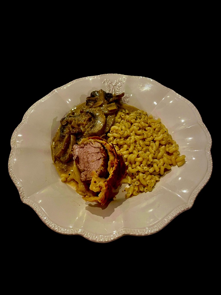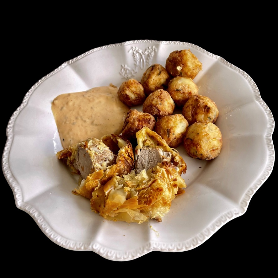 Vous commencez par faire revenir deux petits filets mignons dans du beurre et de l’huile. Quand ils sont bien dorés, vous les couchez en croisant les pointes sur une grande pâte feuilletée couverte de jambon de Parme et de moutarde à l’ancienne. Vous fermez la pâte, la badigeonnez de jaune d’oeuf et la mettez à cuire au four à 200°. Quand la pâte est cuite, la viande l’est aussi; si elle est encore un peu rosée, c’est tout aussi bien : elle sera plus tendre.