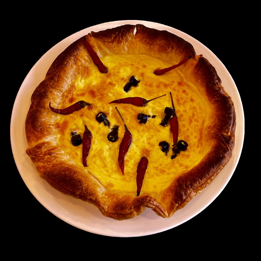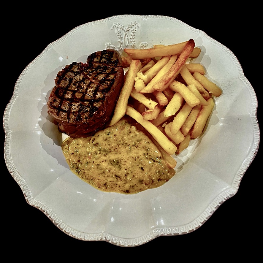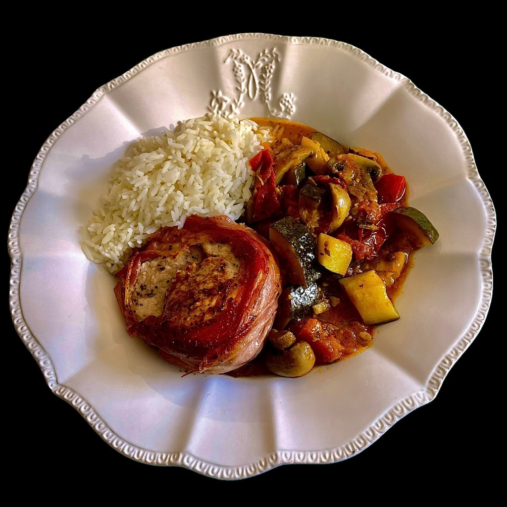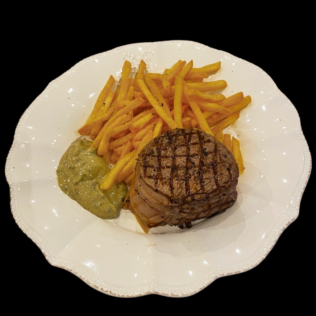 Vous commencez par faire revenir deux petits filets mignons dans du beurre et de l’huile. Quand ils sont bien dorés, vous les couchez en croisant les pointes sur une grande pâte feuilletée couverte de jambon de Parme et de moutarde à l’ancienne. Vous fermez la pâte, la badigeonnez de jaune d’oeuf et la mettez à cuire au four à 200°. Quand la pâte est cuite, la viande l’est aussi; si elle est encore un peu rosée, c’est tout aussi bien : elle sera plus tendre.