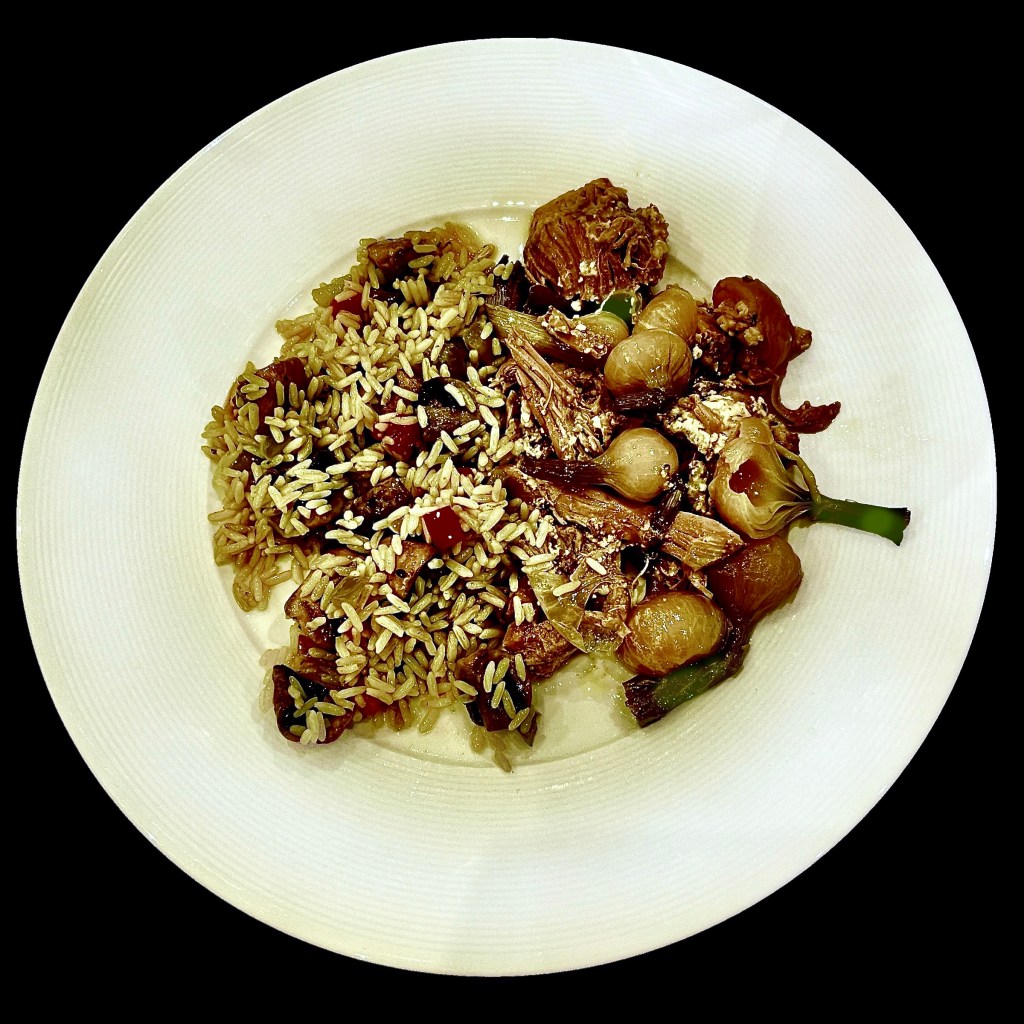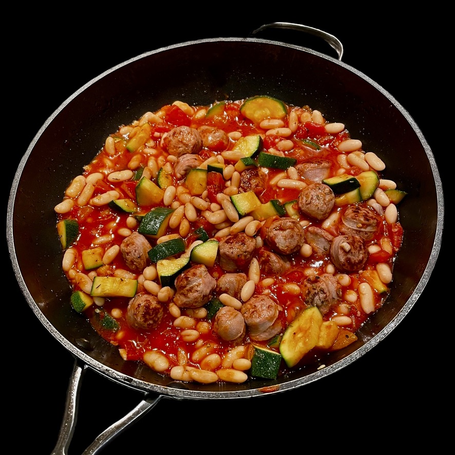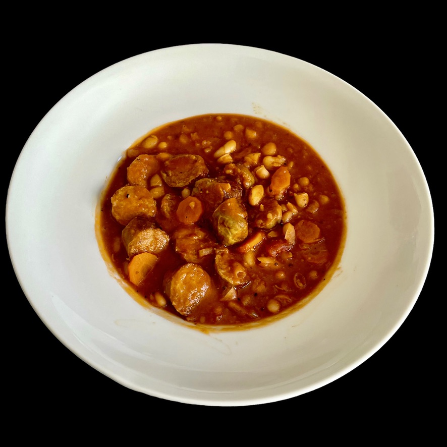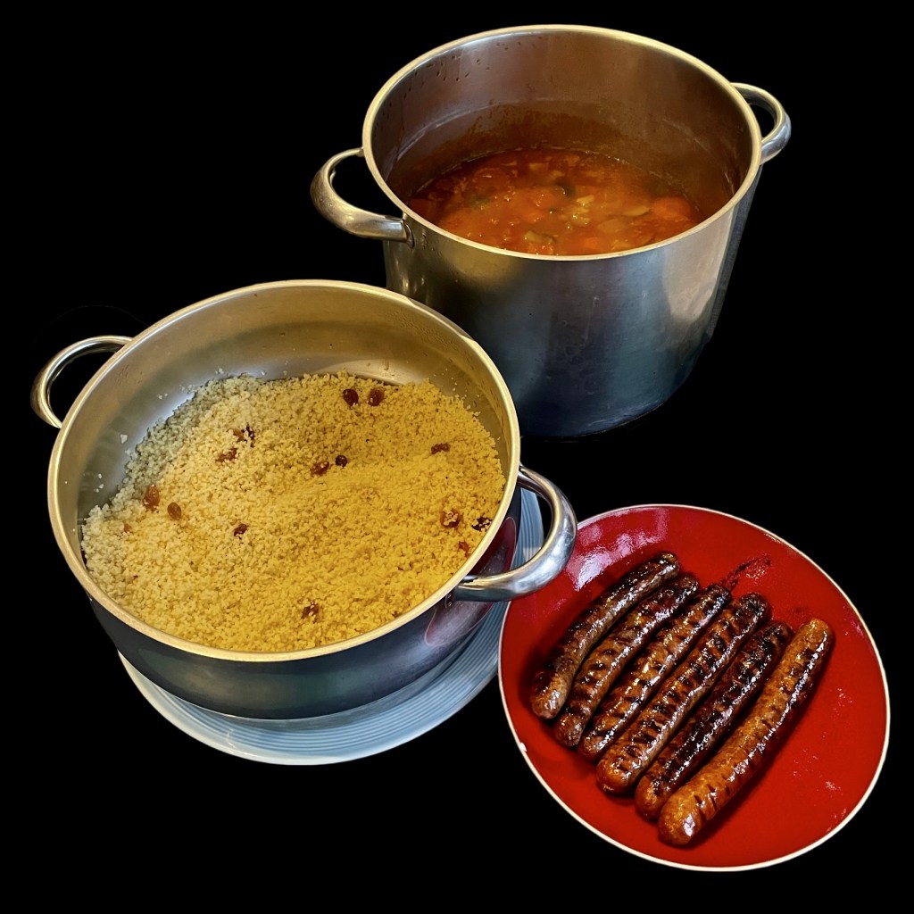 On réserve la viande et on la remplace par quelques oignons coupés fin. Puis on remplace les oignons par des courgettes coupées en deux. Puis on remplace les courgettes par des têtes de choux fleur.