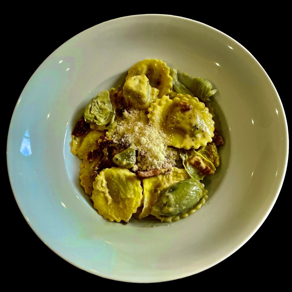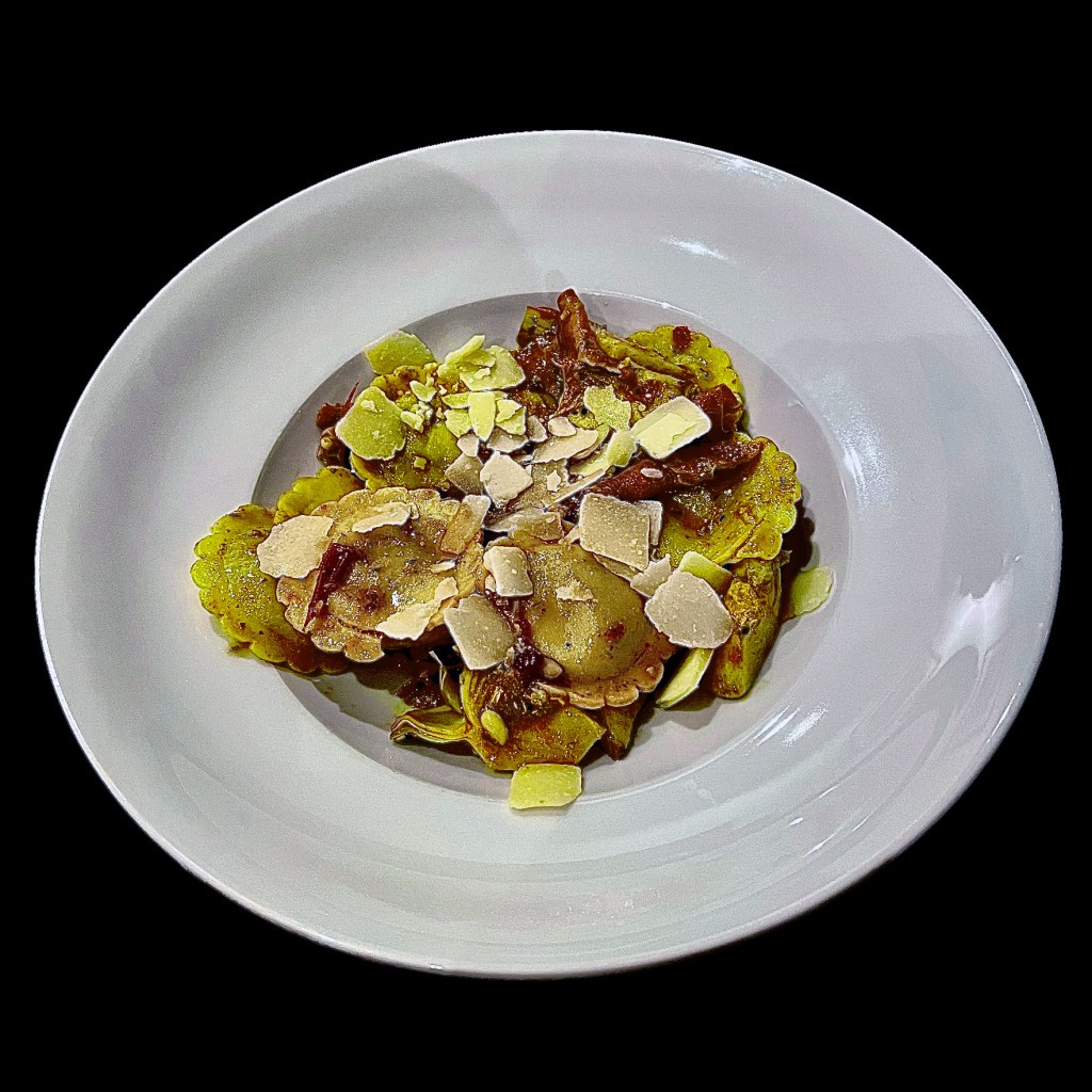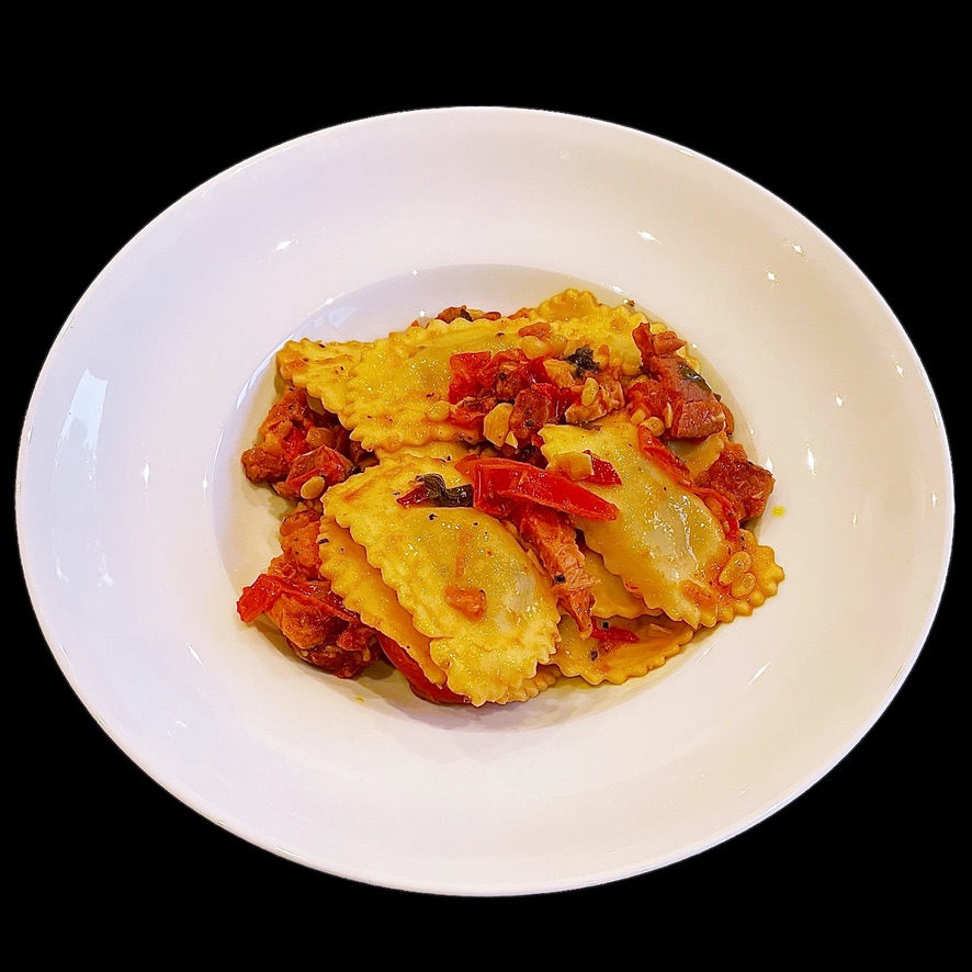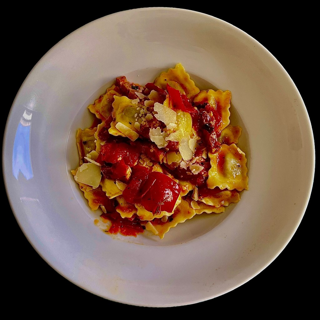Mon épicier italien m’a vendu à grands gestes éloquents des girasoli au homard, de belles ravioles rondes bien charnues que j’ai fait cuire à l’eau frémissante pendant quatre minutes.