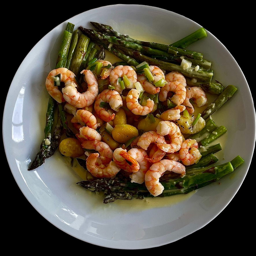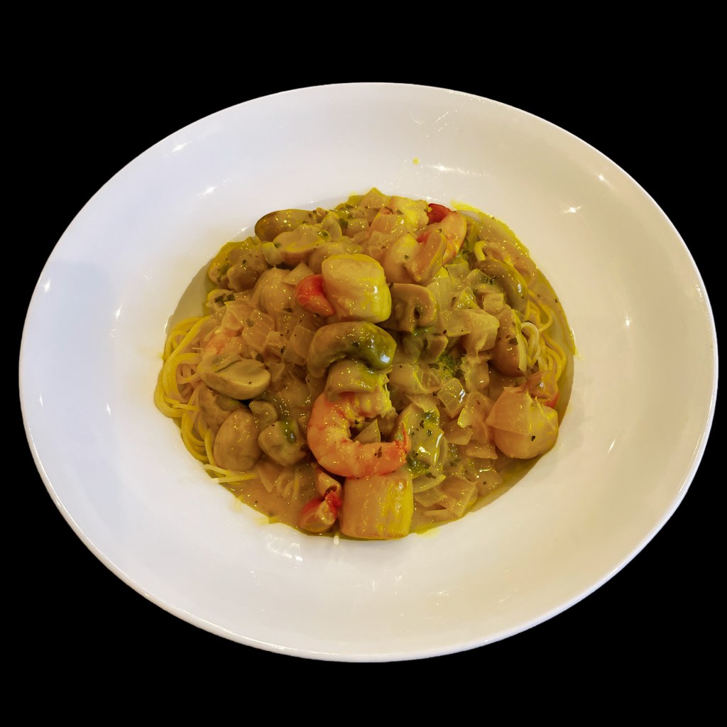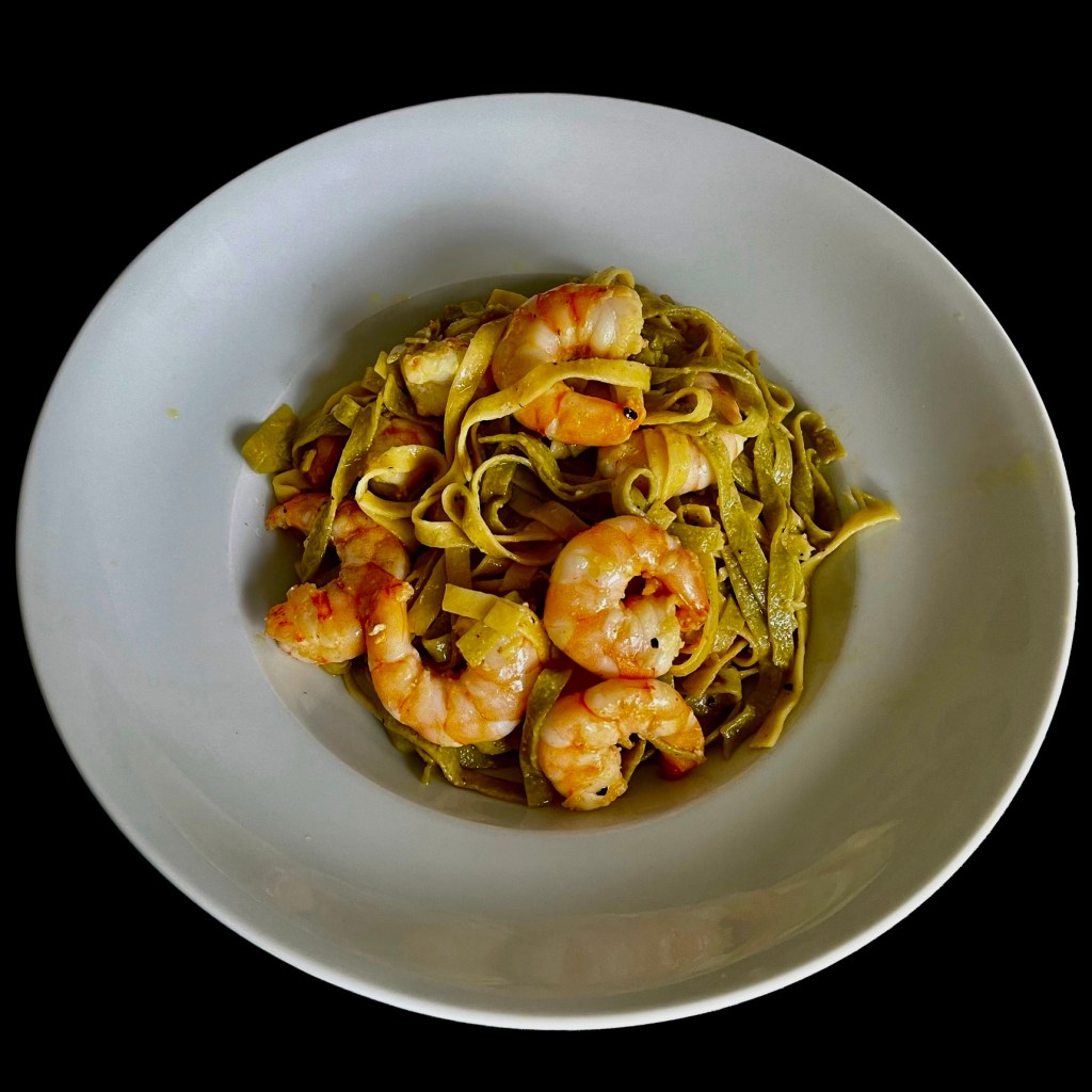 Le lendemain, il n’y a plus de poulet, alors on ajoute des grosses crevettes sautées et c’est toujours aussi bon …