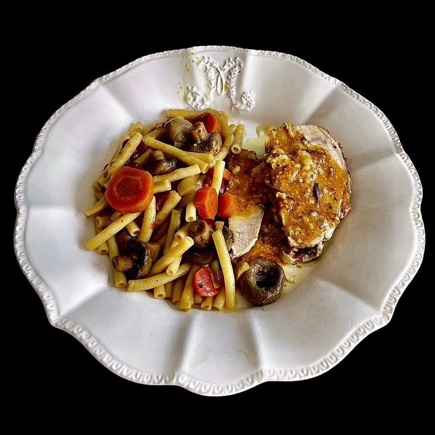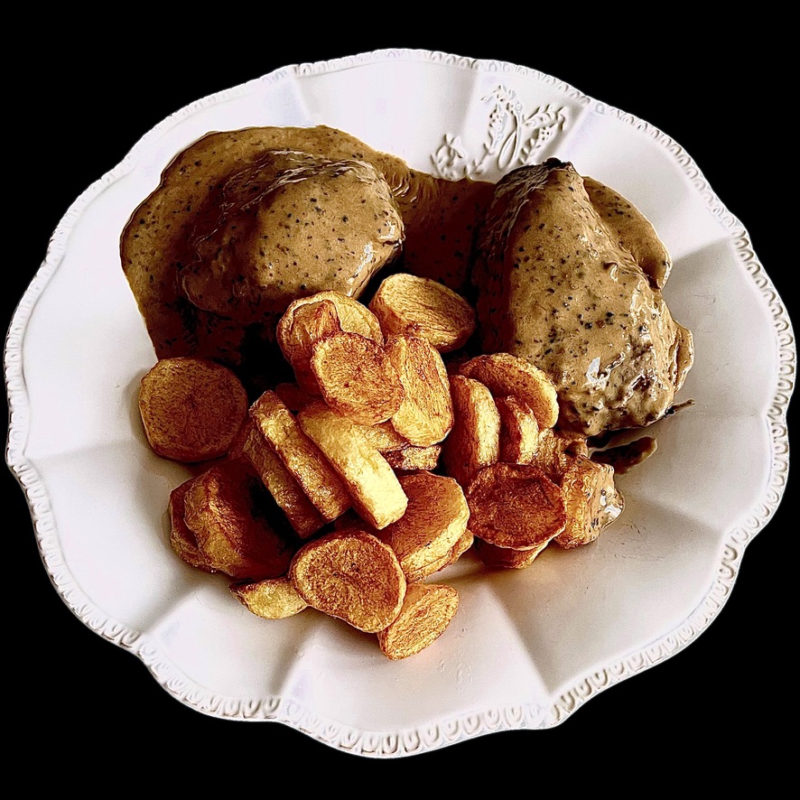 Vous nettoyez et coupez des champignons de Paris. Vous les faites revenir dans du beurre (beaucoup) que vous additionnez de vin blanc sec, de moutarde à l’ancienne, de crème fraiche liquide, de poivre et d’un trait de vinaigre balsamique. Vous laissez réduire paisiblement. Cela sera votre sauce.