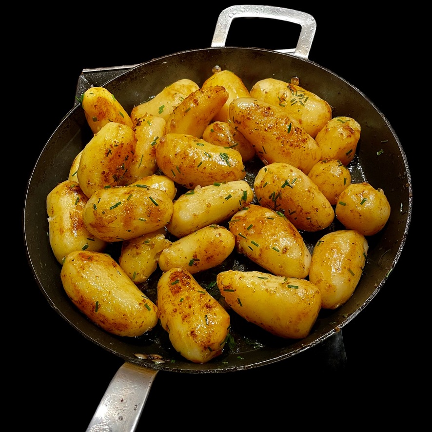 Pendant que ça dore, tu épluches des grosses patates et tu les fais cuire à la vapeur, un peu trop pour qu’elles se défassent. Tu prépares un mélange de beurre fondu, d’huile d’olive, de crème liquide, de sel, de poivre, de ciboulette et de jaunes d’oeuf. Et là, tu écrase tes patates avec la fourchette en y incorporant ton mélange. À la fourchette, j’ai dit car c’est une écrasée, pas une purée !