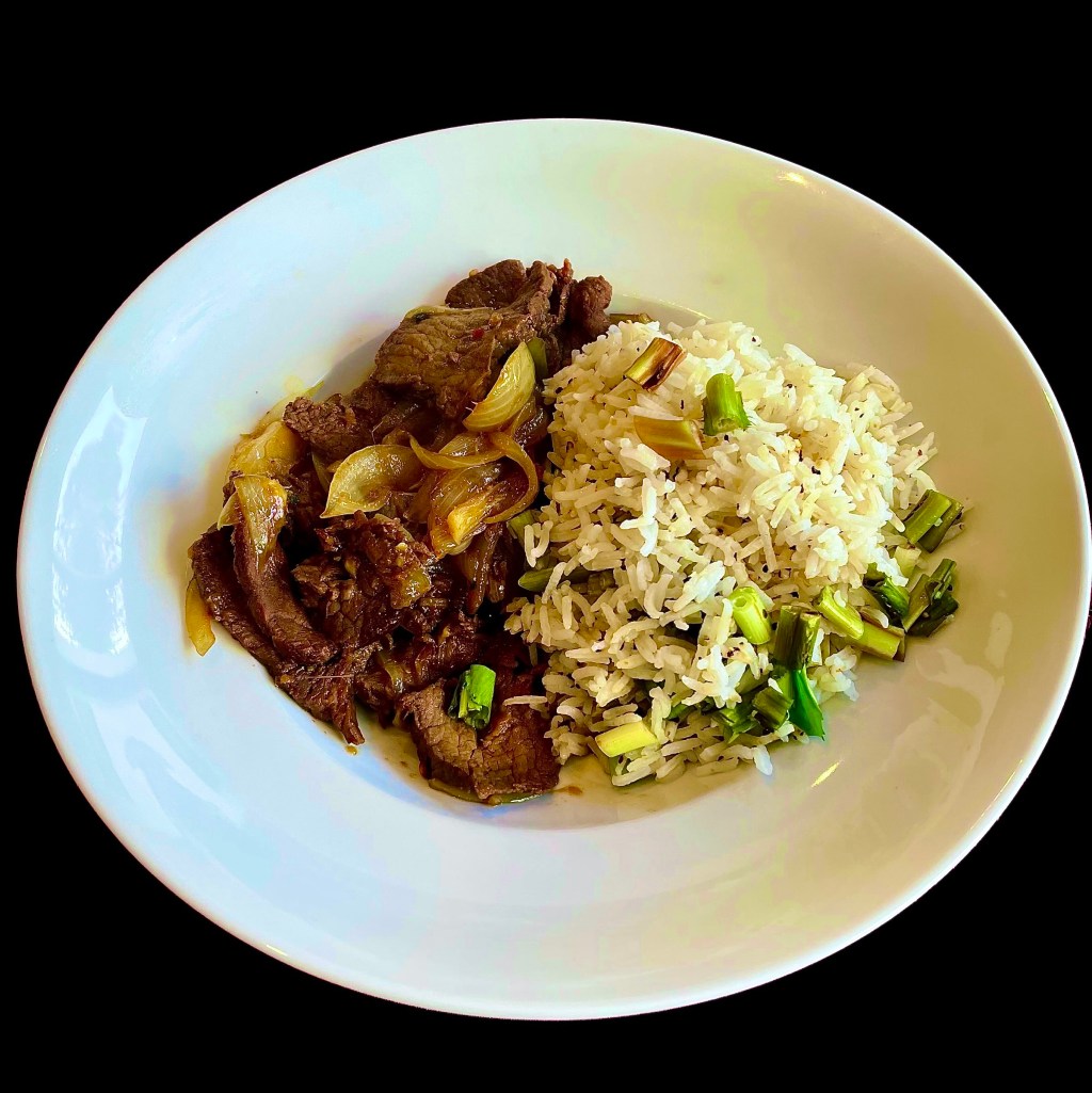 – J’ai fait cuire 200 grammes de riz que j’ai égoutté et ajouté au wok