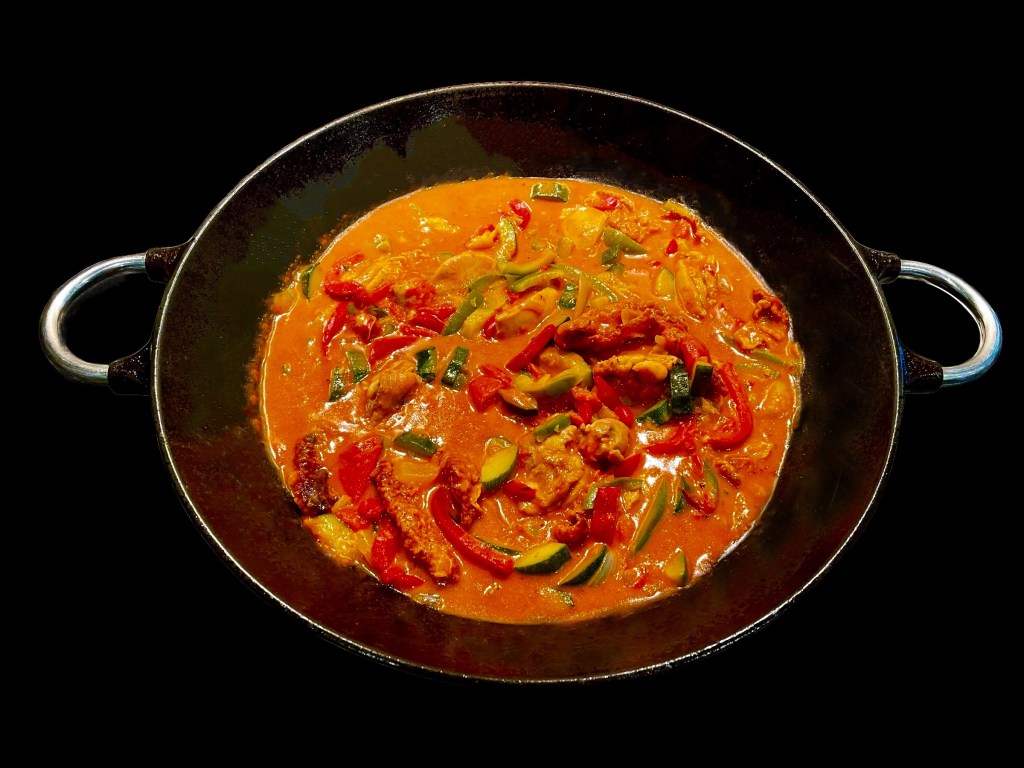 On ajoute à la cocotte, trois ou quatre poivrons en lamelles, des champignons de Paris coupés en deux, trois gousses d’ail écrasées, une bonne quantité de vin blanc sec, une bonne rasade de vinaigre de vin, deux piments et du sel et poivre. Puis on ajoute une bonne quantité de paprika (quatre cuillers à soupe au moins) et une grosse cuiller de curry jaune. On laisse bourglouter un moment, pas trop longtemps. C’est la cuisson au vin.