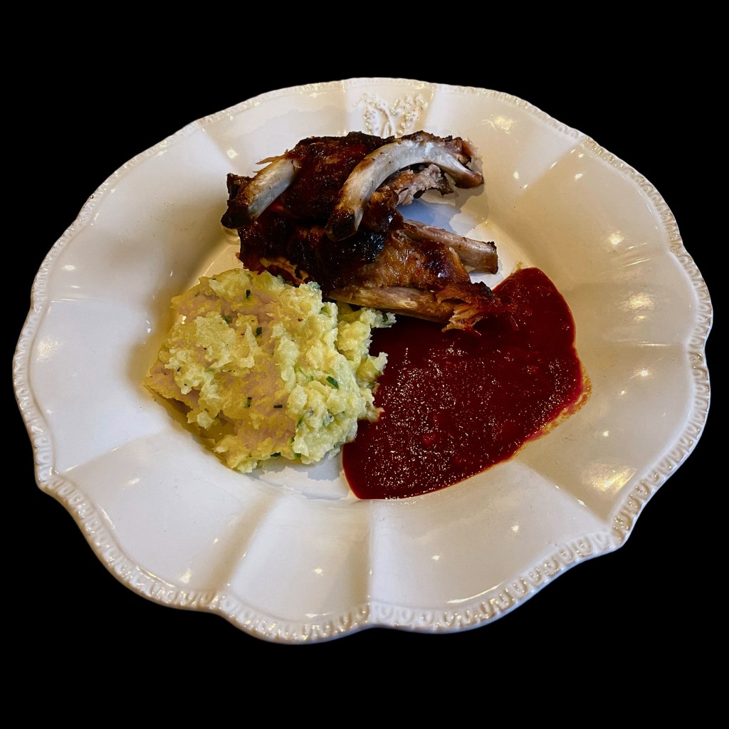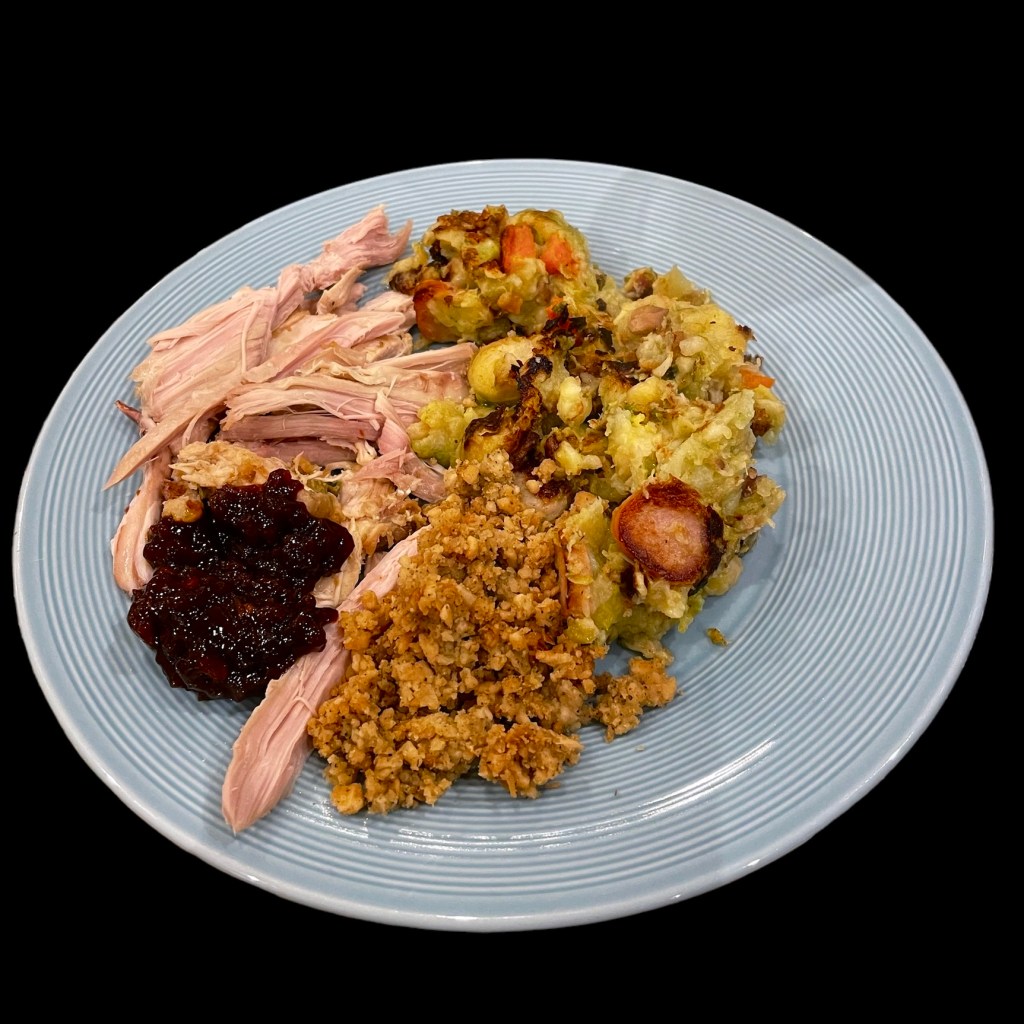 Cela commence par une dinde qui aura cuit des heures à 150 degrés. Puis, il y aura des carottes, des panais et des pommes de terres cuits au four aussi avec plein de graisse d’oie (cf. Aliénor d’Aquitaine). Et puis encore, il y aura des choux de Bruxelles mélangés à des marrons et de la crème fraîche, longuement revenus. Et puis encore, il y aura un mélange de mie de pain et de sauge (le stuffing). Et puis encore, il y aura la « gravy », une sauce à base de fond de volaille pour tout mouiller. Et puis encore il y aura la cranberry sauce, un truc rouge, acide et sucré.