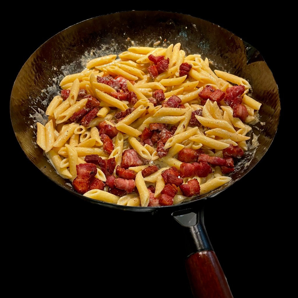 Pour commencer, versons dans un caquelon une boîte de crème épaisse. Puis nous ajoutons le jus d’un citron, puis son zeste, puis du sel, du poivre du moulin et une bonne rasade de vin blanc. Nous posons le caquelon sur un feu doux et laissons réduire. Nous ajouterons, en son temps un peu d’eau de cuisson des pâtes et un filet d’huile d’olive. Juste pour une consistance bien lisse, mais pas top épaisse.