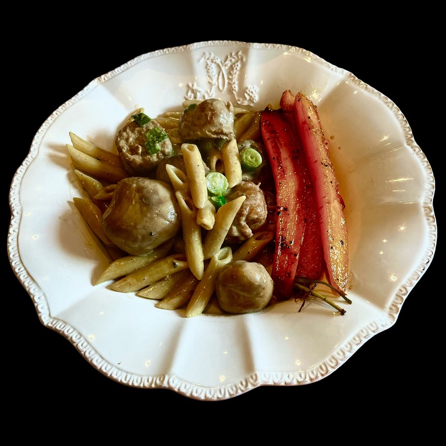 J’avais des penne très al dente. Je les ai mise à feu doux avec une rasade de vin blanc, du sel et du poivre et de l’huile d’olive. Elles ont fini de cuire en prenant une bonne saveur.