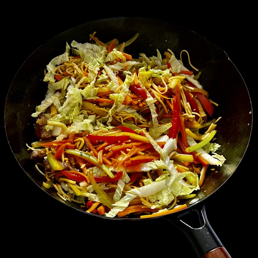 On fait revenir les nouilles chinoises (qui se vendent déjà cuites dans les bonnes épiceries asiatiques). On y incorpore les légumes, le poulet.