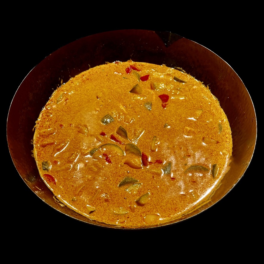 On délaie avec une boite de lait de coco et une brique de crème liquide. On ajoute, en fin de cuisson, du jus de citron, du beurre (ou du ghee), du sel, du poivre et du piment pour rectifier les saveurs.