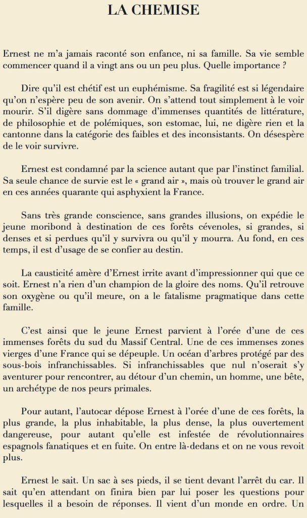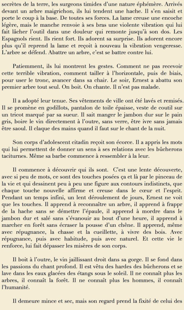 Ernest adorait les forêts et il n’hésitait pas, en plein hiver, à sortir en pleine nuit la hache à la main couper les arbres qui gênaient le développement du bois. Il traitait le monde aussi comme une forêt, prêt à bien des sacrifices pour permettre aux êtres humains de s’épanouir.