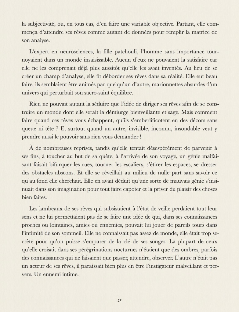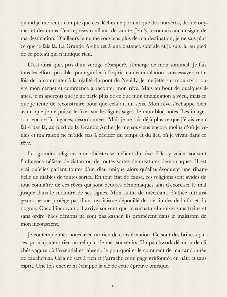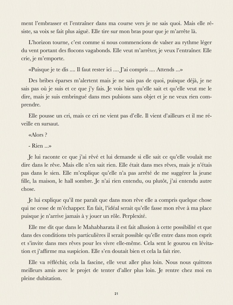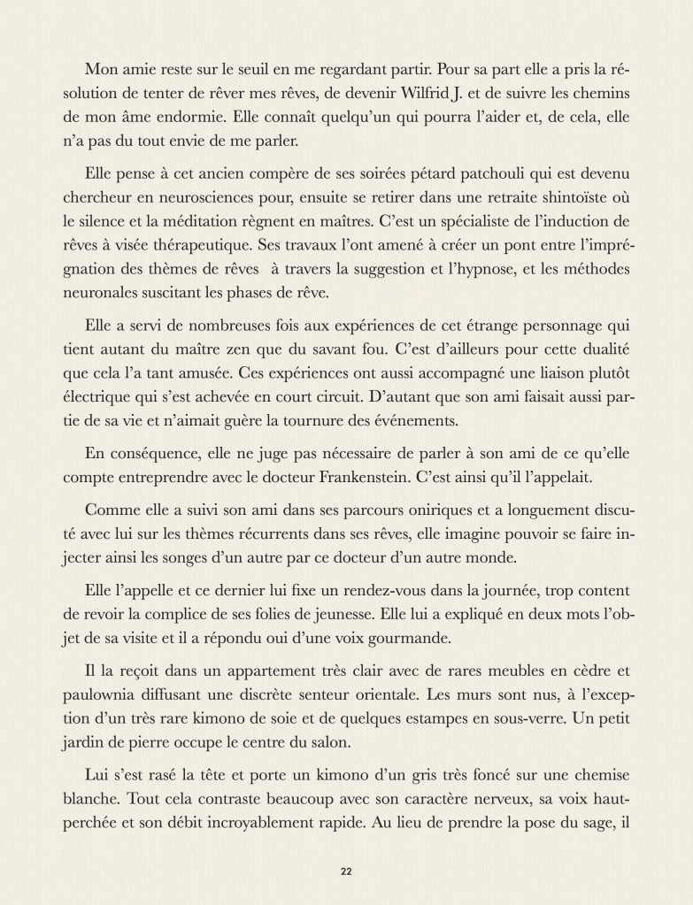 Que se passe-t’il dans nos rêves ? Que se passe-t’il quand on rêve ? Que se passe-t’il quand on rêve de quelqu’un qui rêve ? Que se passe-t’il quand on se trouve dans le rêve d’un autre ? Qui est en haut de cette cascade de rêves qui laisse chaque personnage perdu, ne sachant ni d’où il vient, ni où il va ? Ce tout petit roman, fait pour être lu en une nuit, apporte la réponse grandiose, philosophique, scientifique et religieuse à cet ensemble de questions essentielles. Pour parler de rêve, dans notre langue, nous ne disposons que de quatre mots : rêve, songe, onirique et cauchemar. Comment une langue comme la notre peut n’offrir que si peu de termes pour décrire un univers si vaste et si complexe ? Ce roman est la réponse physique, métaphysique, transcendante et immanente à ce paradoxe qui fait se télescoper la philosophie Zen et les singularités quantiques dans une collision astrale définitive.