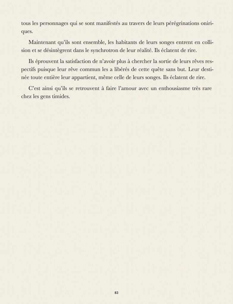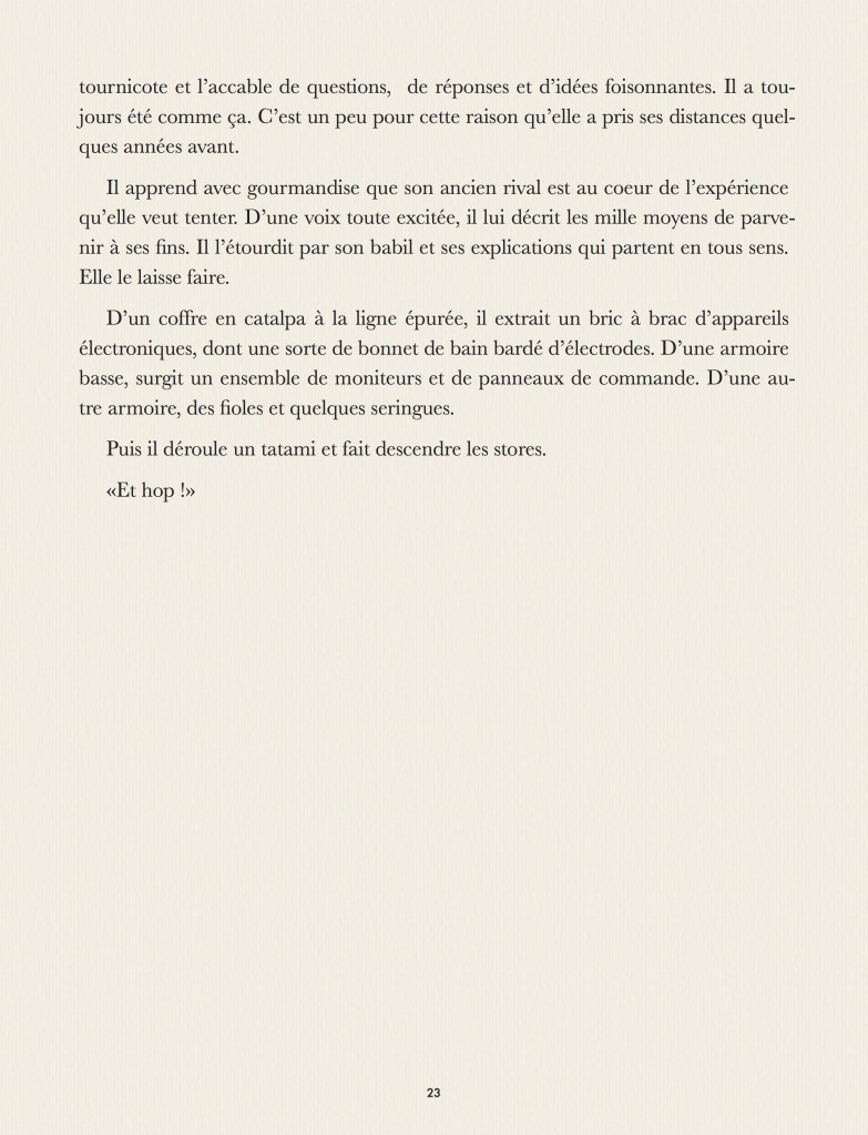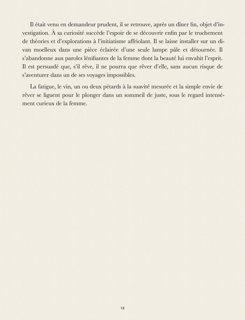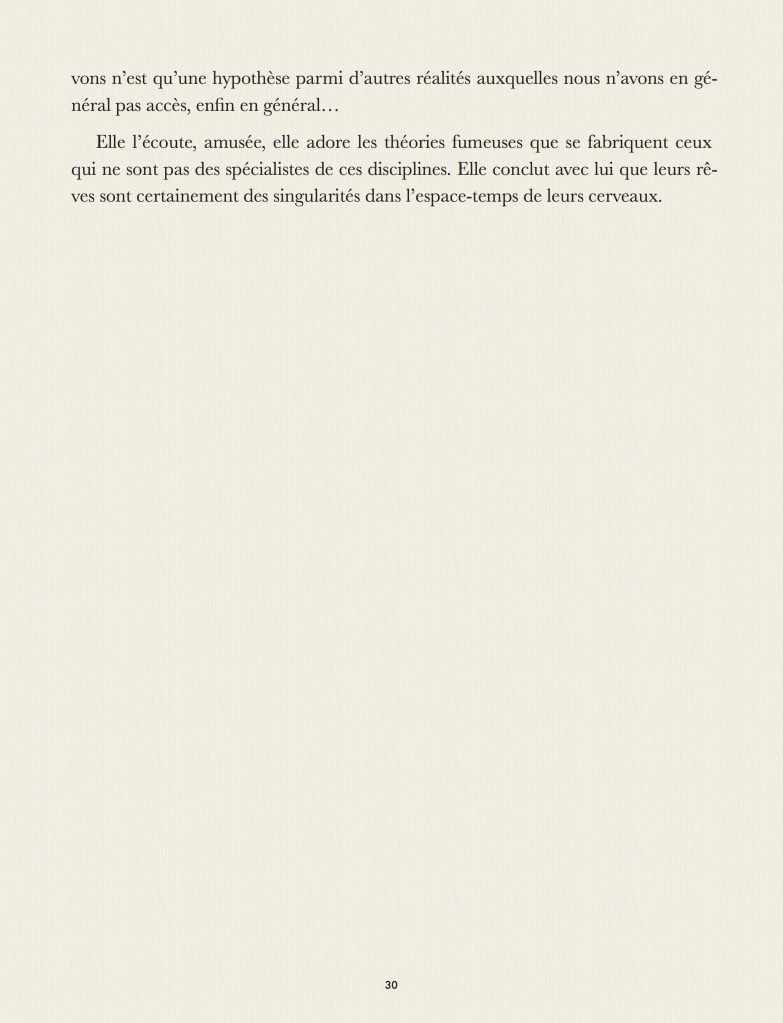 Que se passe-t’il dans nos rêves ? Que se passe-t’il quand on rêve ? Que se passe-t’il quand on rêve de quelqu’un qui rêve ? Que se passe-t’il quand on se trouve dans le rêve d’un autre ? Qui est en haut de cette cascade de rêves qui laisse chaque personnage perdu, ne sachant ni d’où il vient, ni où il va ? Ce tout petit roman, fait pour être lu en une nuit, apporte la réponse grandiose, philosophique, scientifique et religieuse à cet ensemble de questions essentielles. Pour parler de rêve, dans notre langue, nous ne disposons que de quatre mots : rêve, songe, onirique et cauchemar. Comment une langue comme la notre peut n’offrir que si peu de termes pour décrire un univers si vaste et si complexe ? Ce roman est la réponse physique, métaphysique, transcendante et immanente à ce paradoxe qui fait se télescoper la philosophie Zen et les singularités quantiques dans une collision astrale définitive.
