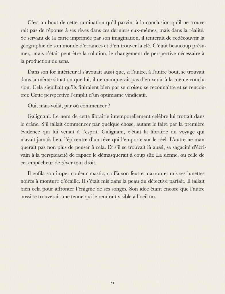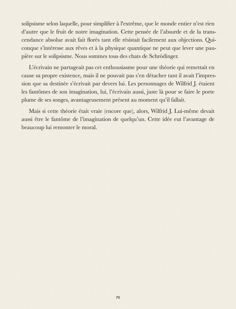 Ce roman ne fait pas partie de la trilogy de quatre romans car il est une sorte de polar à double détente. Mais, comme d’habitude, il remet en cause la réalité en en inventant, non pas une autre, mais deux autres …