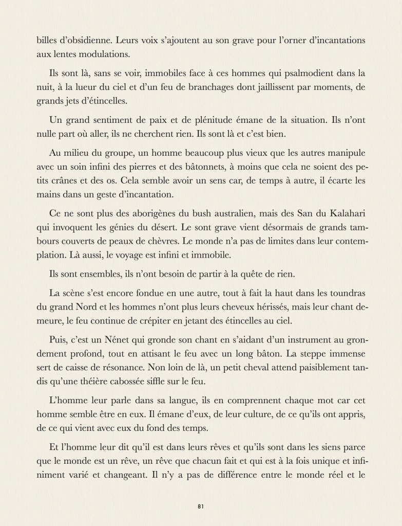 Puis, un jour, ils nous demandèrent de quoi pouvoir écrire tout ce qu’ils savaient. Ils affirmèrent que les paroles s’envolaient tandis que les écrits restaient. Mais nous leur répondîmes que les écrits sont surtout sources de mésentente et de guerre entre les tenants de tel ou tel écrit et que, dans notre monde, la parole est bien plus vivante que dans le leur. Nous les avions tous écoutés et notre mémoire collective n’en perdrait jamais le moindre mot.