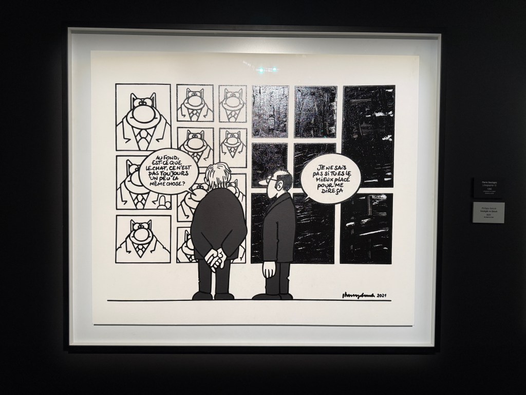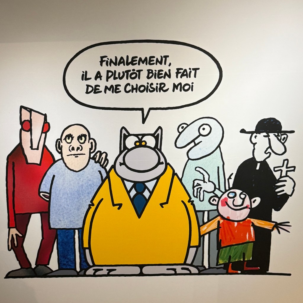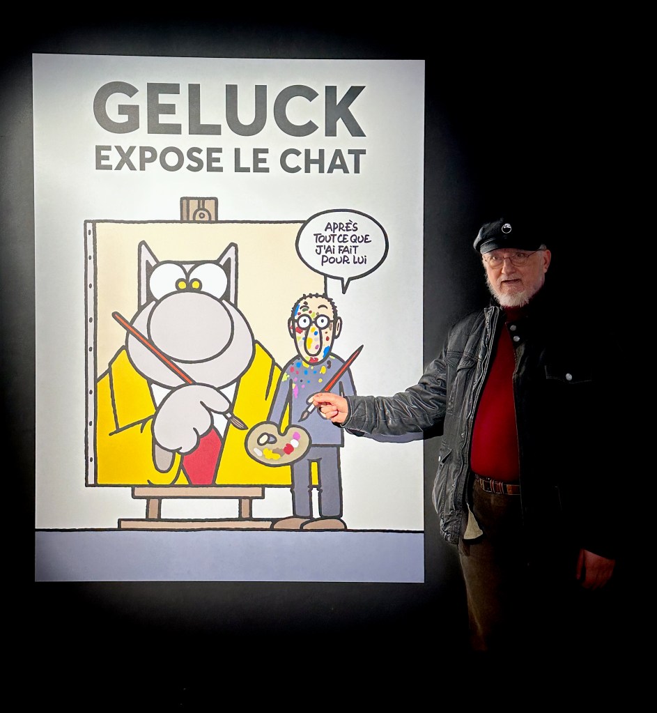 Il y a bientôt une quarantaine d’années j’ai découvert le Chat de Philippe Geluck, je pense dans la revue À Suivre qui me faisait découvrir la bande dessinée littéraire. J’e avais adoré l’humour décalé, l’ironie qui, comme chacun sait, doit être mordante sans trop laisser de marques. L’humour Belge, toujours marqué par une pointe de surréalisme à la Magritte.