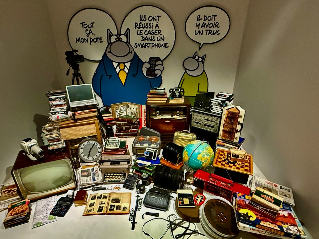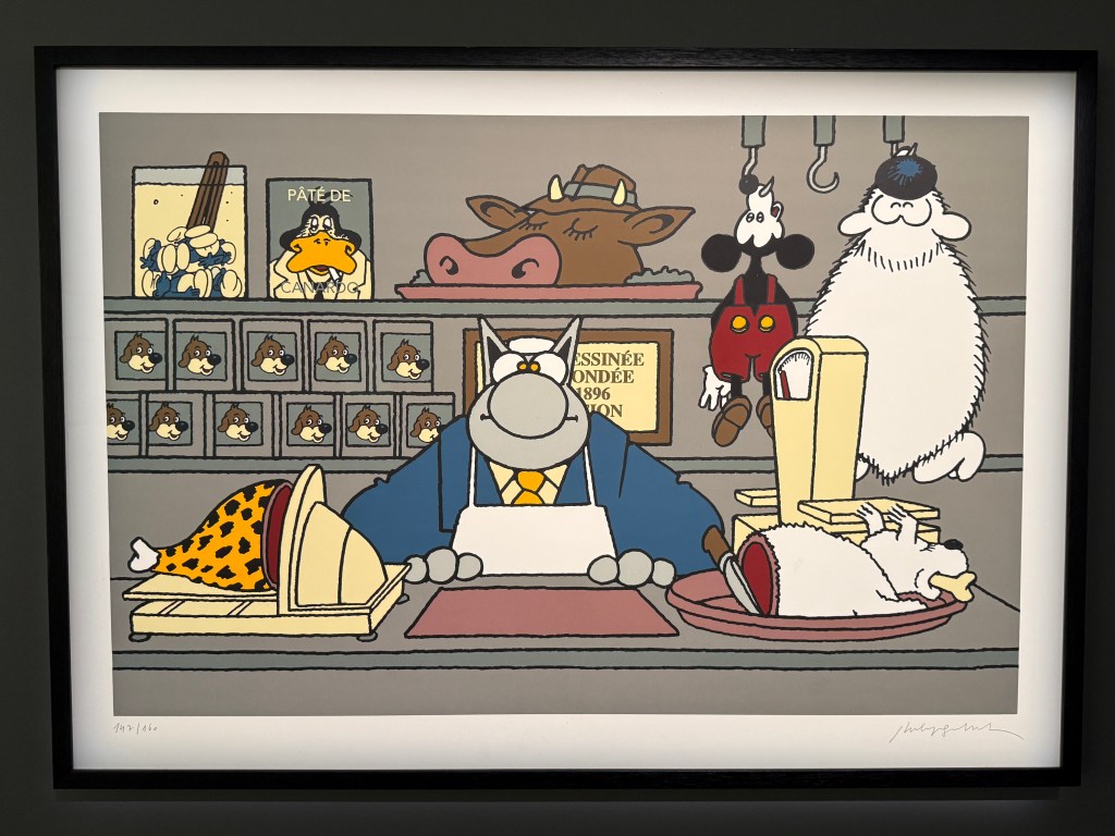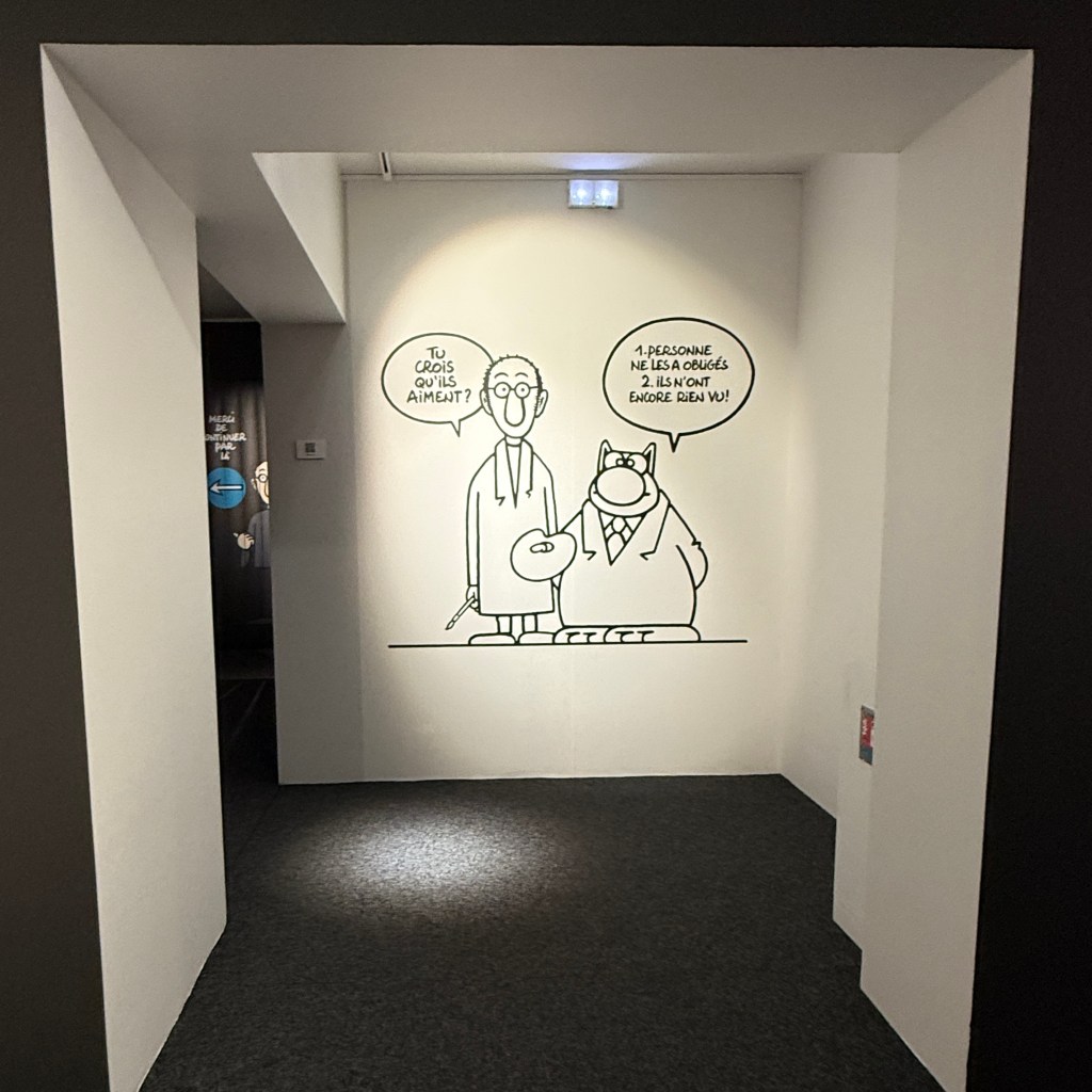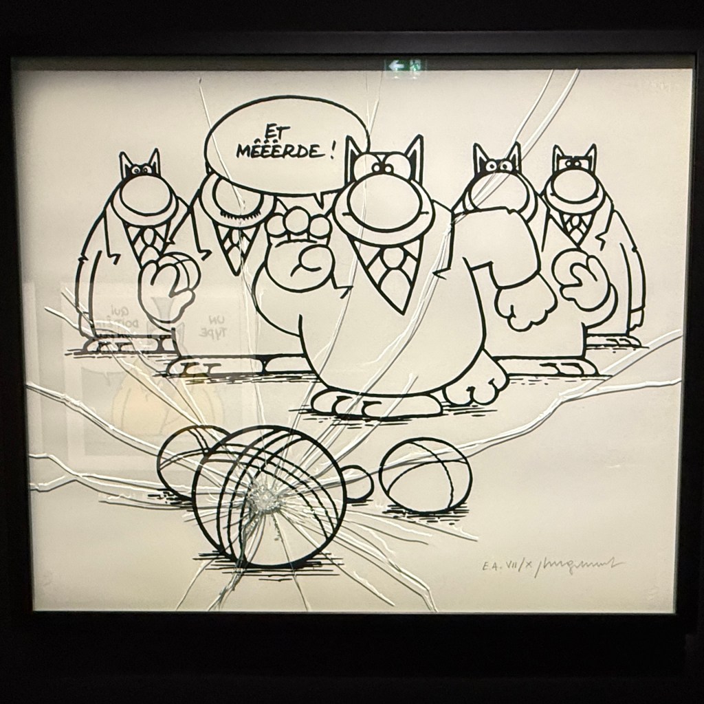 Il y a bientôt une quarantaine d’années j’ai découvert le Chat de Philippe Geluck, je pense dans la revue À Suivre qui me faisait découvrir la bande dessinée littéraire. J’e avais adoré l’humour décalé, l’ironie qui, comme chacun sait, doit être mordante sans trop laisser de marques. L’humour Belge, toujours marqué par une pointe de surréalisme à la Magritte.