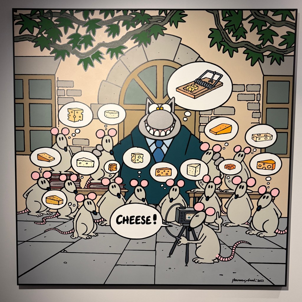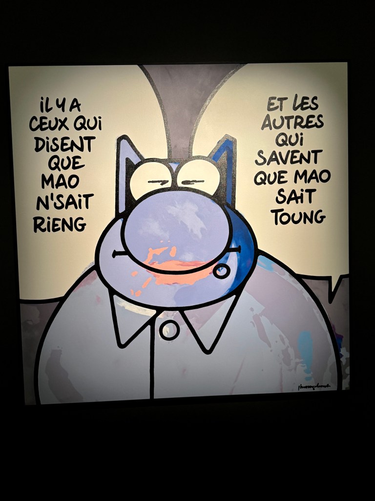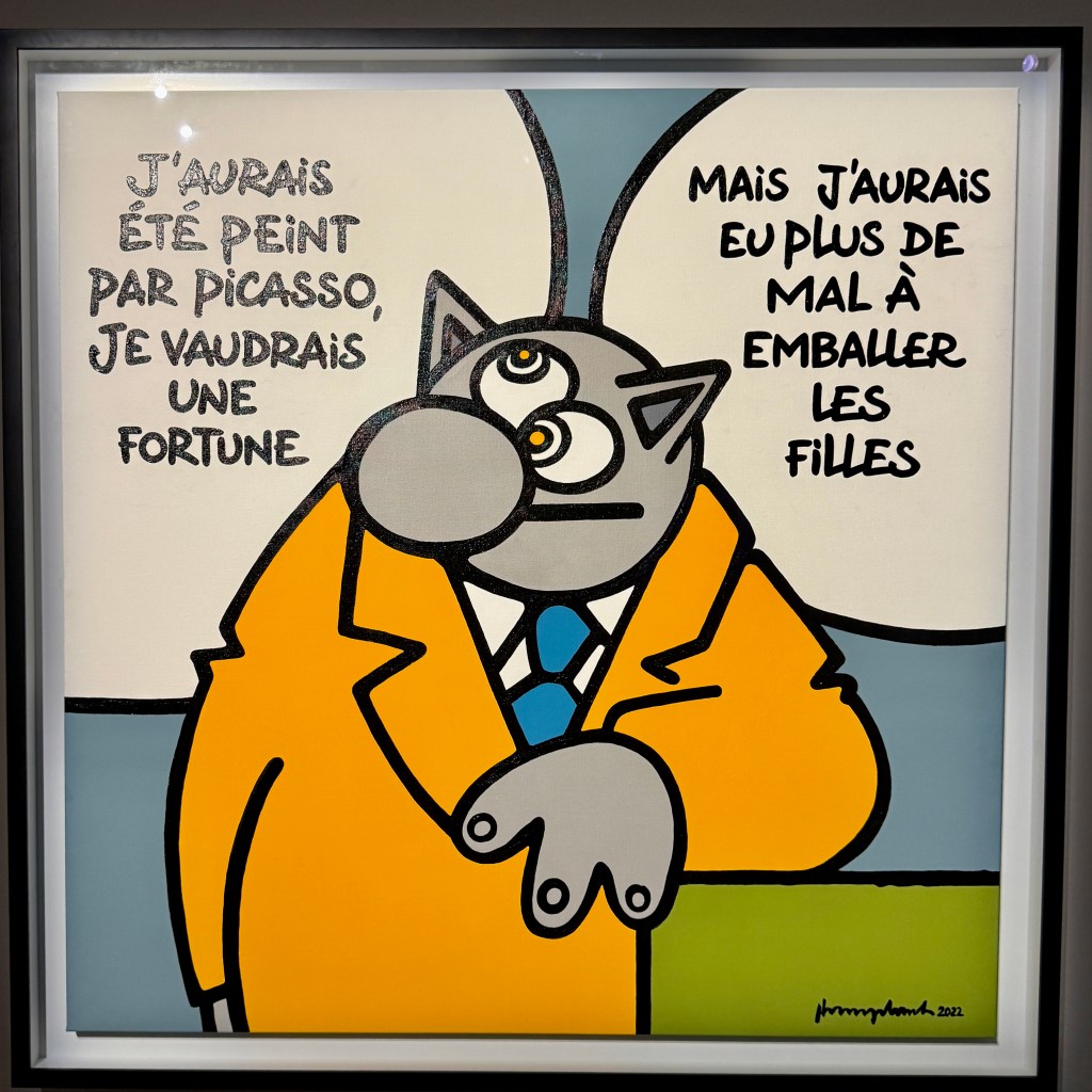 Hier, nous sommes allés, bravant le danger sournois de la pandémie, sur les Champs Élysées où sont exposées les sculptures en bronze du chat de Geluck. Depuis longtemps déjà, je suis un adepte de cet humour qui marie l’art et la dérision dans un feu d’artifice de jeux sémantiques jamais dénués de sens et d’arrière pensées humanistes.