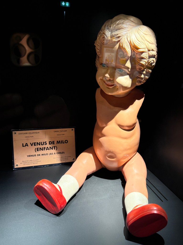 Cette utilisation surréaliste de l’art n’est pas sans me rappeler Damien Hirst qui avait envahi Venise, en 2017, de ses statues démesurées d’une mythologie revue et corrigée, révélant, par exemple, un Mickey couvert de coquillages, parmi les statues antique.