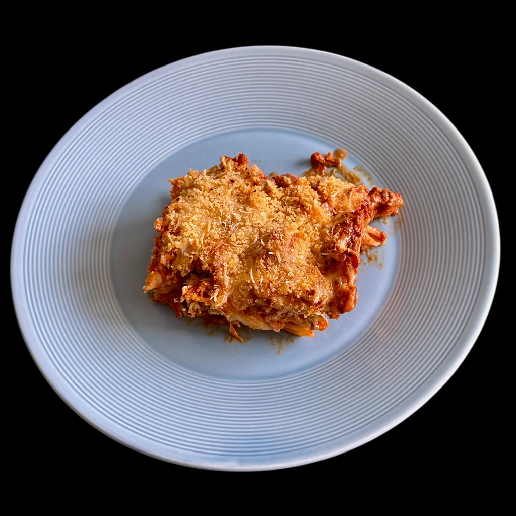C’est un plat qui varie avec ce qu’il y a dans le frigo et avec l’inspiration, mais il demeure toujours mon gratin de pâtes depuis quarante ans. C’est dire !