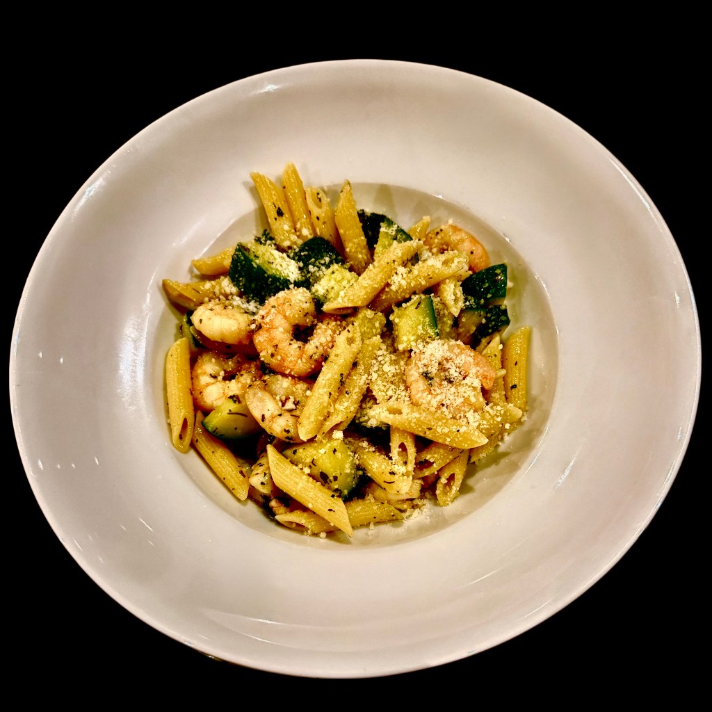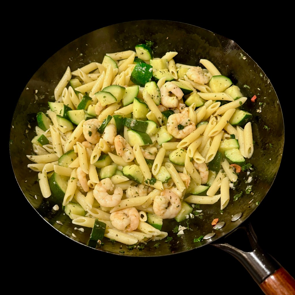 Tu fais cuire tes penne bien al dente, puis avec une araignée, tu les jette dans la grande poêle avec les scampi et les courgettes que tu as remises. Et tu laisse mijoter, ce qui avec le restant d’eau de cuisson les amène à leur cuisson idéale.