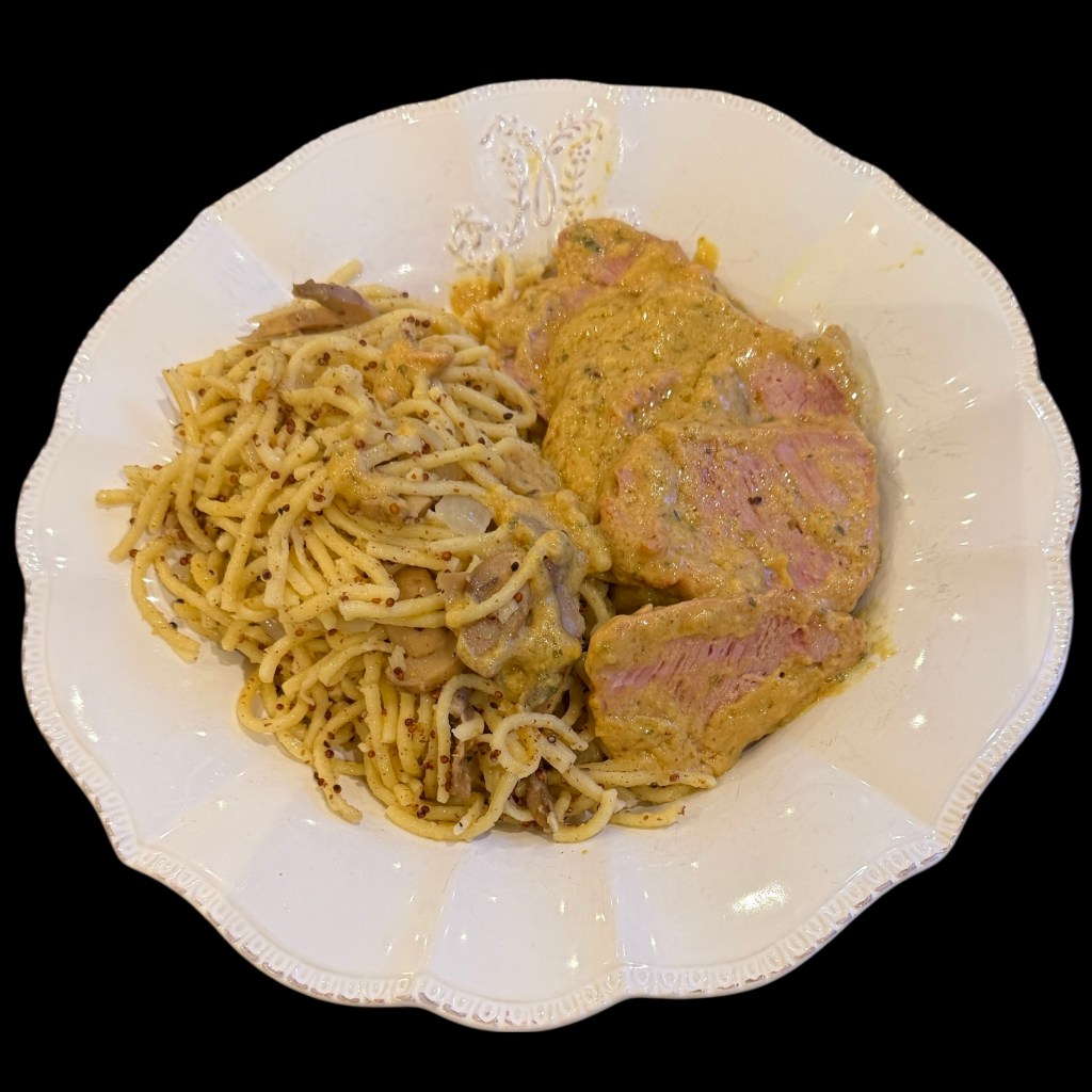 J’ai fait revenir des champignons et des échalotes avec du beurre dans une sauteuse et puis j’y ai jeté mes pâtes avec une bonne cuiller de moutarde à l’ancienne. Les spätzles, c’est bon quand c’est un petit peu croustillant.