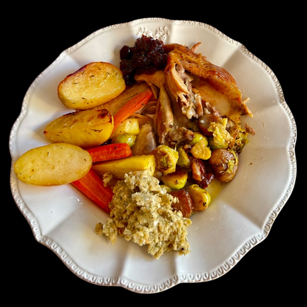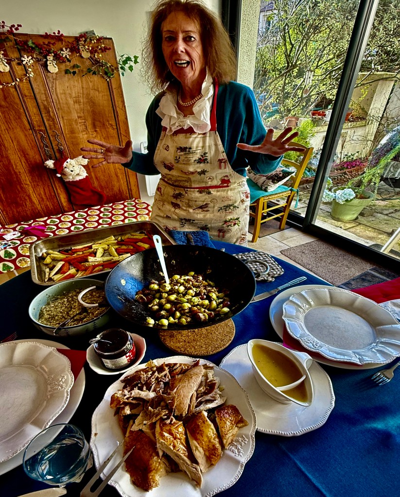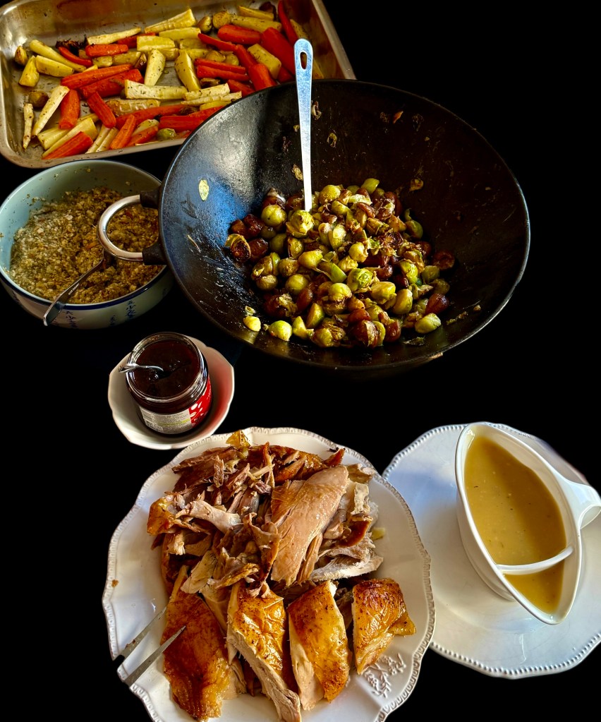 Chez nous, depuis quarante cinq ans, il n’est pas question d’y déroger, c’est le chapon cuit à l’anglaise (donc pas bouilli, comme vous croyez, mauvaises langues), mais longuement rôti et servi avec des panais, des carottes, des pommes de terre, des choux de Bruxelles, des marrons, des boudins blancs (en lieu et place des saucisses anglaises), du stuffing (mie de pain à la sauge), de la confiture de canneberges, et de la gravy, une sauce au fond de volaille, légèrement relevée au madère et au poivre.
