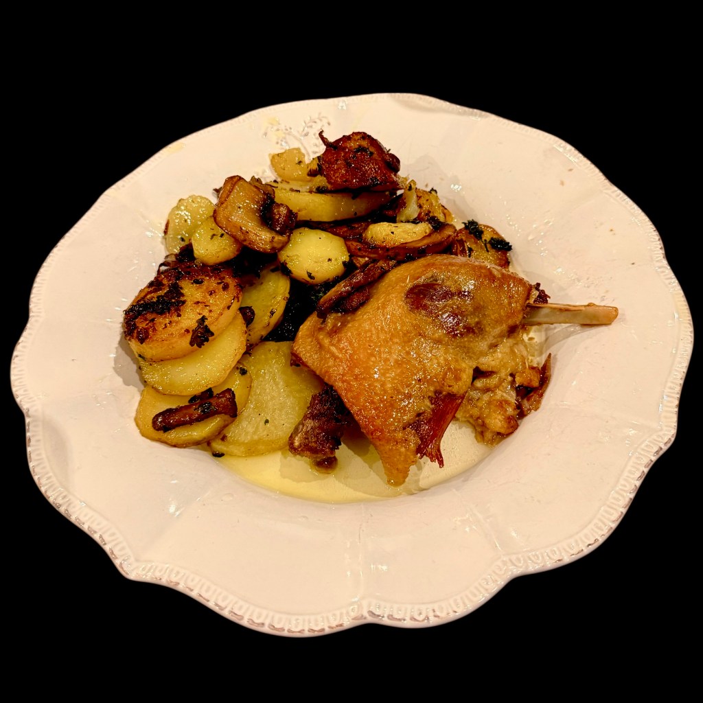 Et puis, on ouvre la boîte, on en extrait les cuisses que l’on dispose sur un plat qui va au four, la peau dessus. On récupère la graisse et la gelée et on les met dans une très grande poêle. Là, on ajoute des pommes de terres pelées et coupées en rondelles, des gros champignons coupés en lamelles, des giroles, du persil et de l’ail hachés en quantité, un peu d’huile de truffe, du sel et du poivre. On peut choisir d’y mettre des cèpes, mais les cèpes, y deviennent mou en cuisant !
