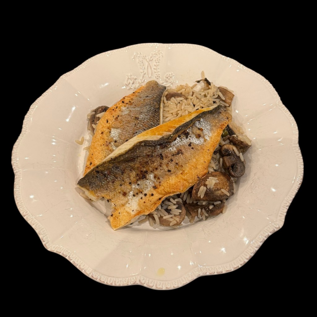 Le bar, vous le frottez au sel et au poivre après l’avoir vaporisé d’huile d’olive. Puis vous le faites cuire sur sa peau à feu assez vif. Quand c’est cuit au-dessus, c’est que la peau est devenue croustillante à souhait.