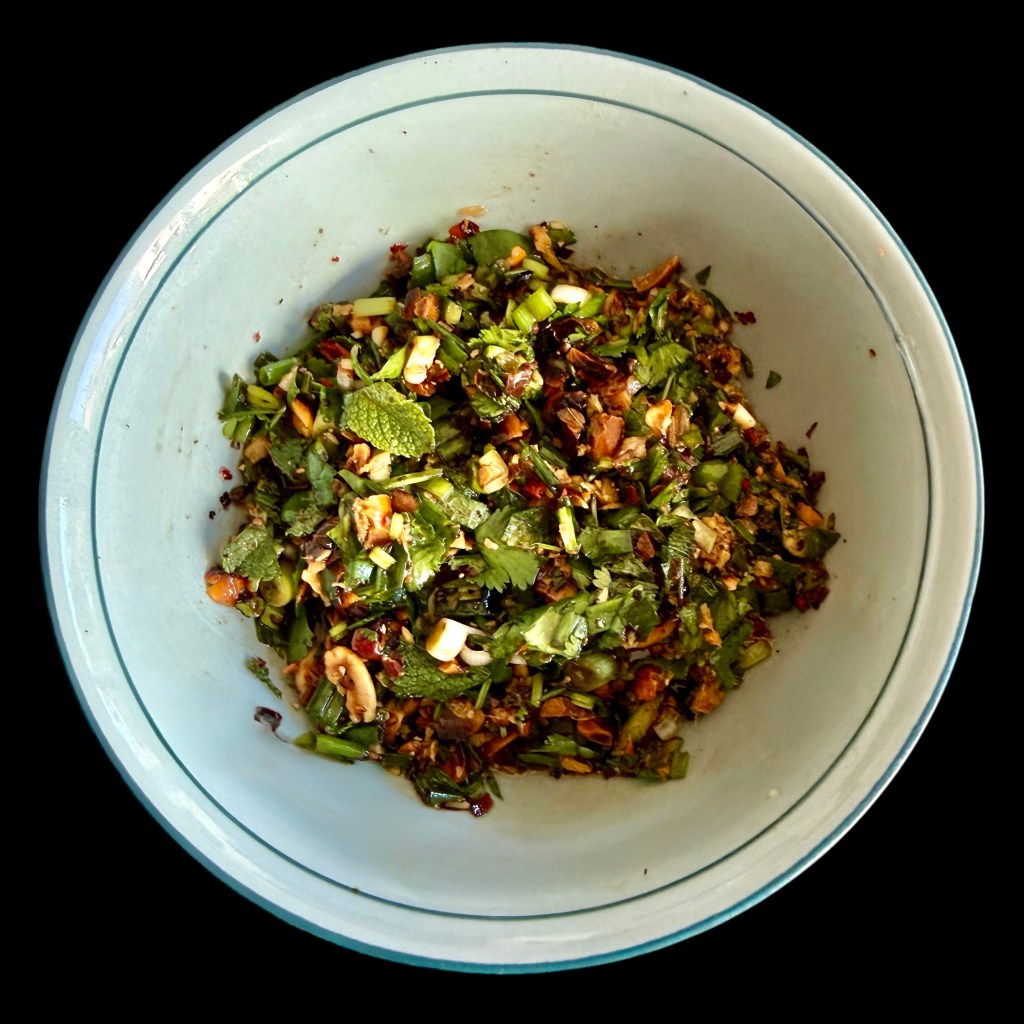 Puis j’ai pris le reste du mélange d’ail de de gingembre, de citron vert, de sauce de soja light, de cacahuètes torréfiées hachées. J’y ai haché de la ciboulette, de la cébette, de la menthe, de la coriandre, et j’ai ajouté un peu d’huile neutre. J’ai touillé sans trop écraser le tout.