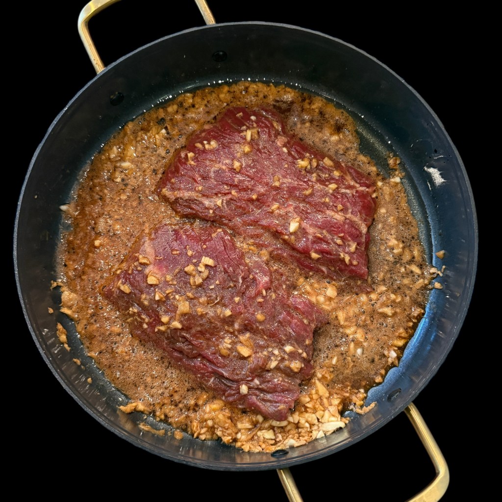 J’ai débarrassé mes bavettes des restes de marinade et je les jetées dans une poêle très chaude où l’huile prend instantanément feu. je les retourne au bout de trente secondes et je les retire pour les laisse reposer une ou deux minutes.