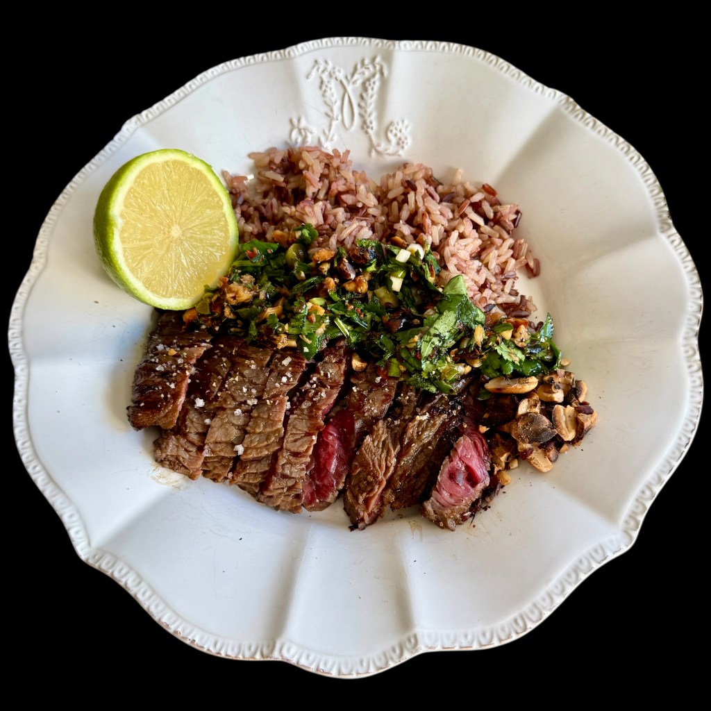 J’ai sorti mes bavettes pour qu’elles soient à la température de la pièce, je les ai striées au couteau sur les deux faces, puis je les ai saisies dans une poêle avec de l’huile très chaude. J’ai ajouté des cubes de beurre, j’ai arrosé la viande, l’ai retournées et ai continué à la cuire une ou deux minutes, puis je l’ai retirée pour qu’elle soit saignante à souhait. Je l’ai laissée reposer.