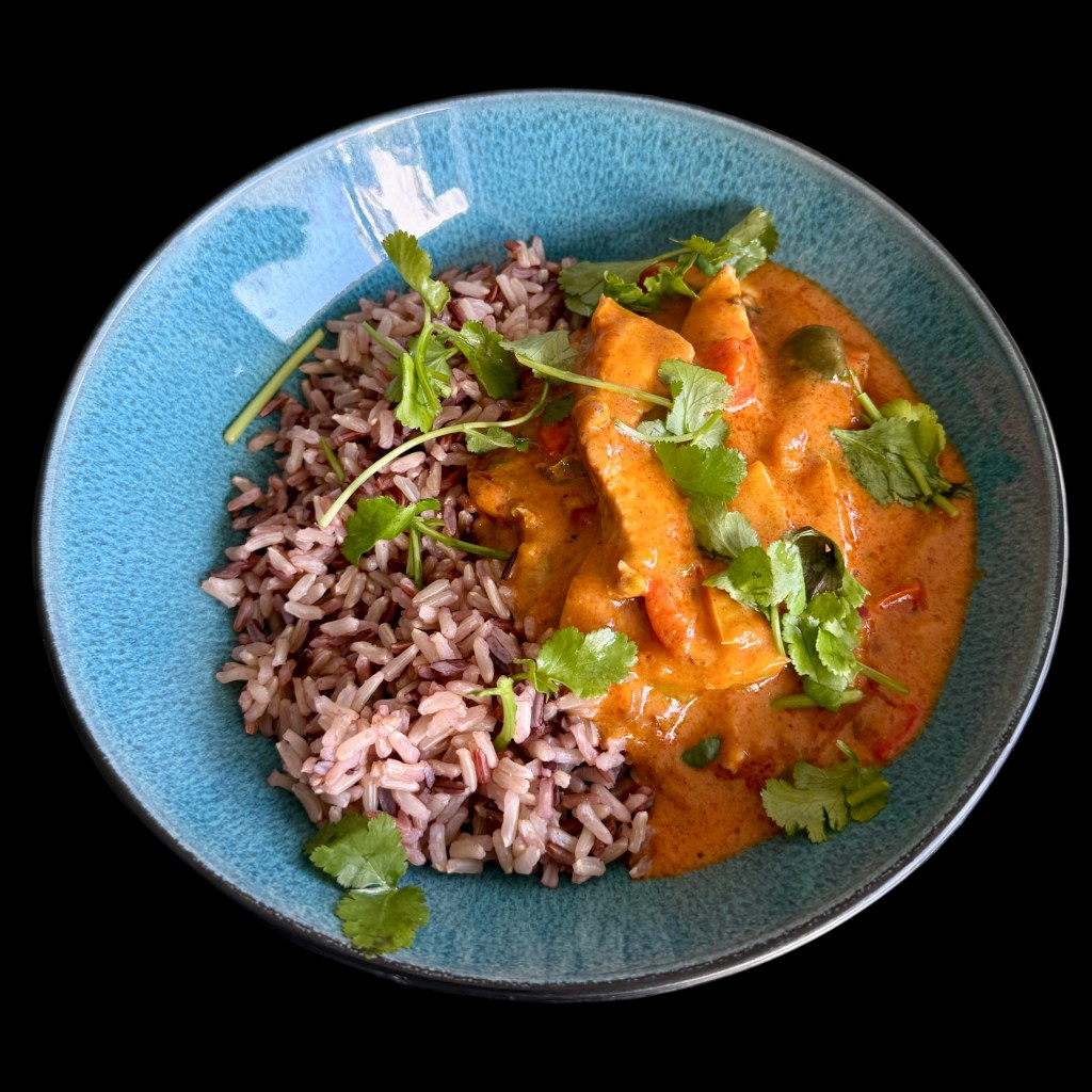 J’essaie parfois de reproduire cette madeleine de Proust à la dynamite. Pour ce faire,, je choisis de grosses crevettes que je décortique et fends en deux pour ôter le boyau. je les fais mariner dans de l’(huile d’olive, de l’ail et du poivre. Je coupe deux courgettes en dés et je les fais mariner dans le même mélange. Je coupe un poivron rouge en fines rondelles et je le plonge dans la même marinade. Je fais revenir les courgettes, puis j’ajoute les poivrons. J’arrête la cuisson quand mes légumes sont encore ferme et je les plonge dans un mélange de pâte de curry rouge et de lait de coco. Là je les laisse mijoter.