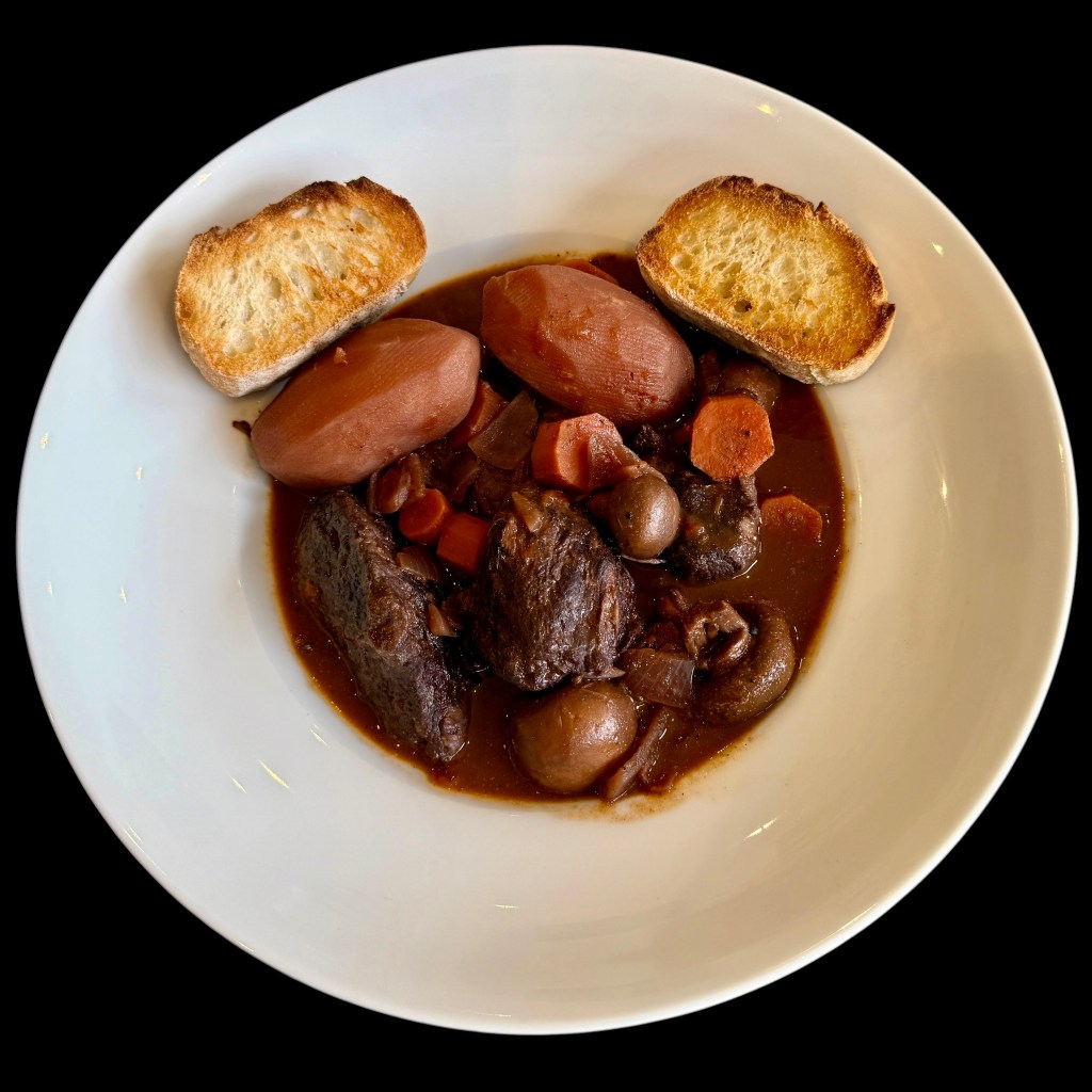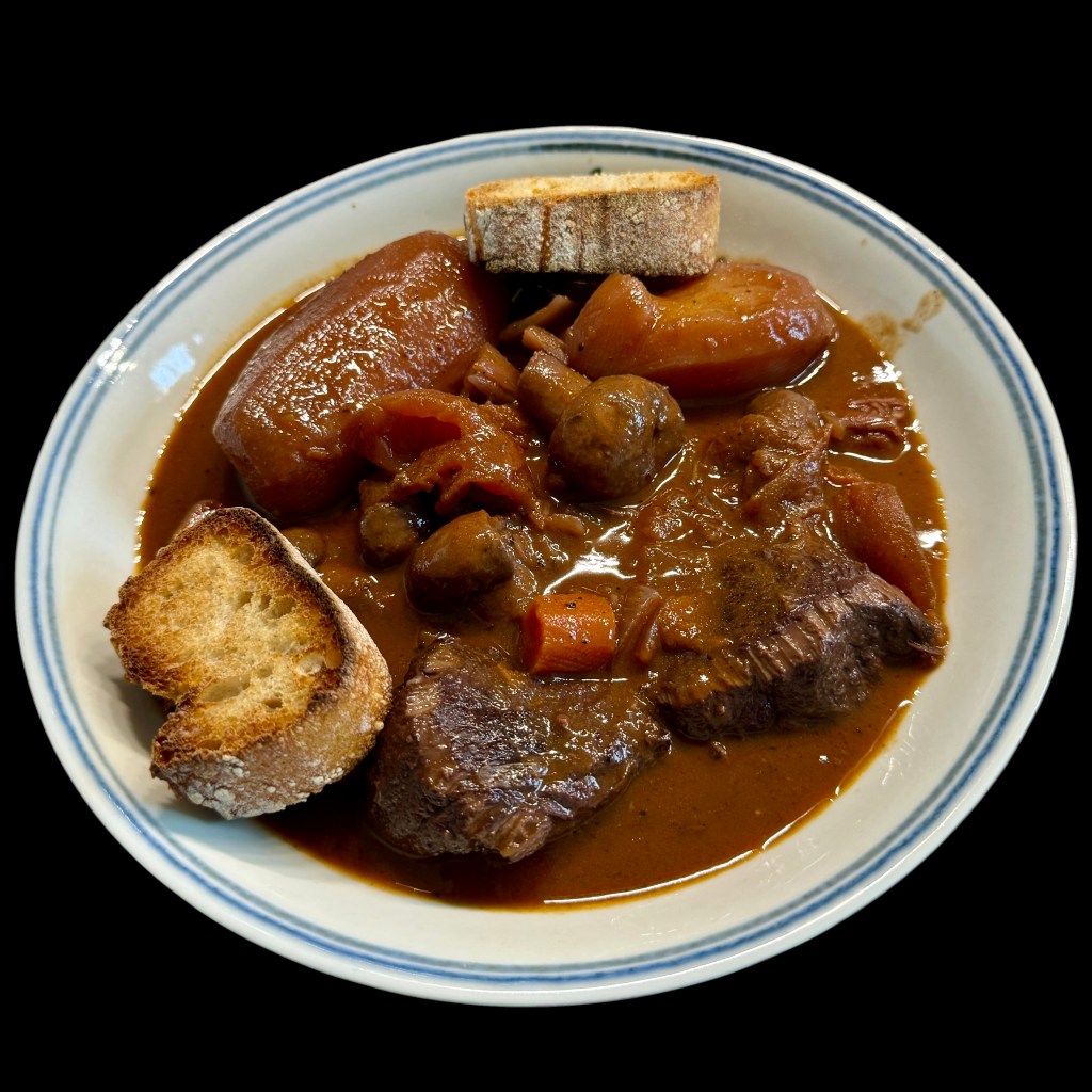 Bon, revenons en au bourguignon. Comme j’en ai préparé un pour nos amis les Windsor et que nous l’avons dégusté chez eux, je me suis lancé dans la recette originale de ce plat.