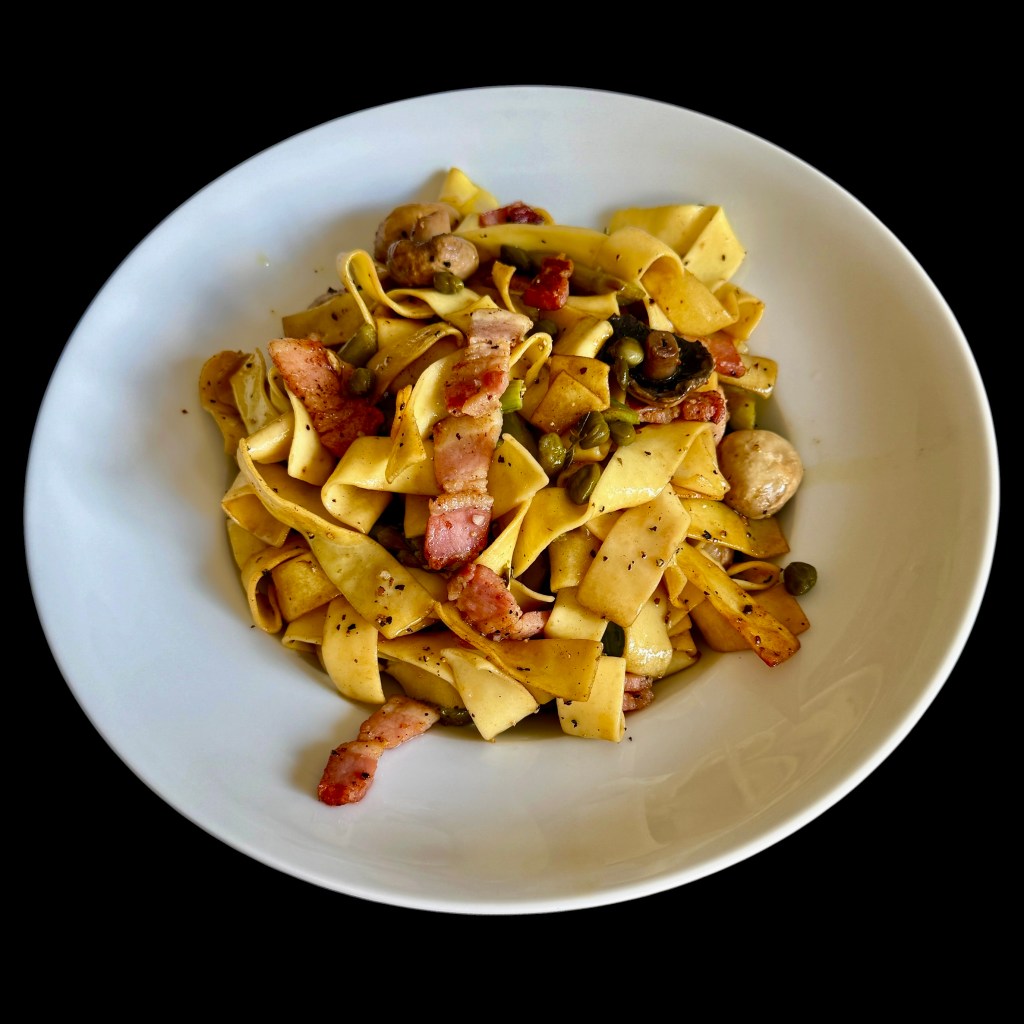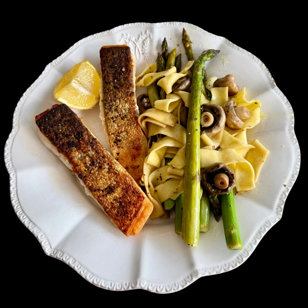 Le lendemain, il ne restat plus de saumon, alors j’ai fait frire des lardons jusqu’à les rendre croustillants, puis j’ai déglacé la poêle au vinaigre balsamique. Je les ai ajouté au plat réchauffé à feu doux, après avoir coupé le restant d’asperges en petits segments, et j’ai ajouté quelques câpres et du poivre concassé. Cela m’a donné un plat tout aussi savoureux, mais plus terrien…