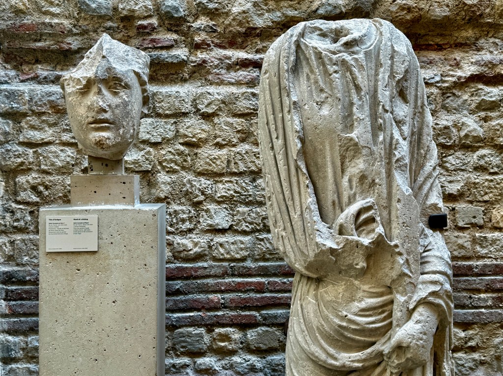 4 – La rénovation moderne qui se veut respectueuse d’une authenticité à gros sabots. On a bourré le leu de portes en verre, de plateaux intermédiaires et de parois en béton blanc. Ça se voudrait élégant, c’est tout simplement vulgaire. Les ultimes traces de l’antiquité sont raturées par des systèmes d’exposition ratiotinés qui brisent les grands espaces romains et rendent l’ensemble mesquin.