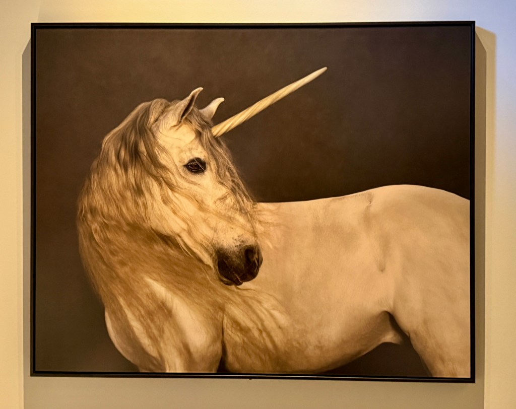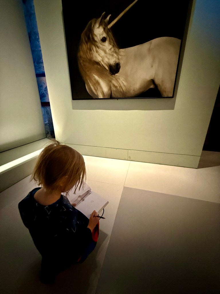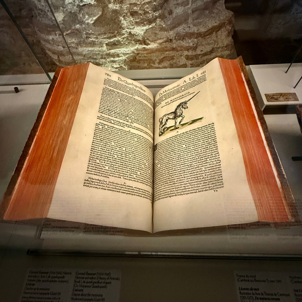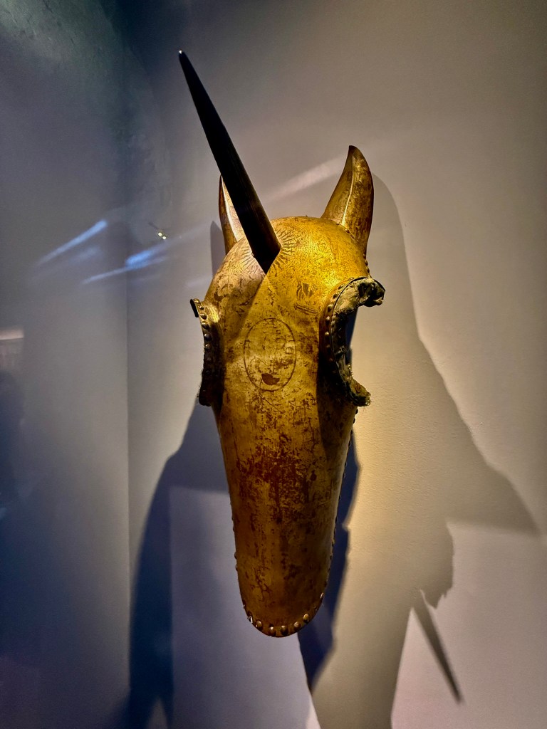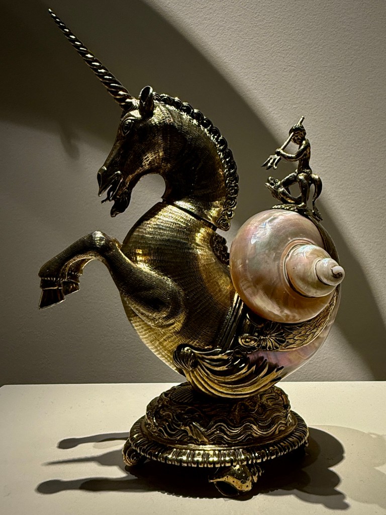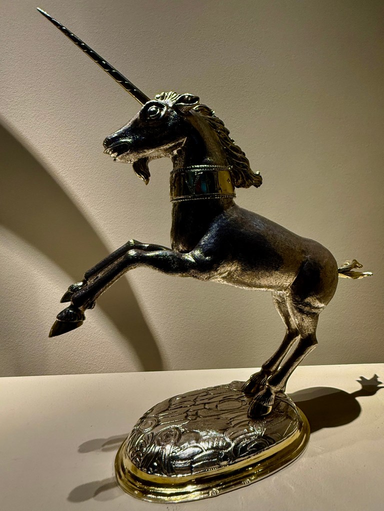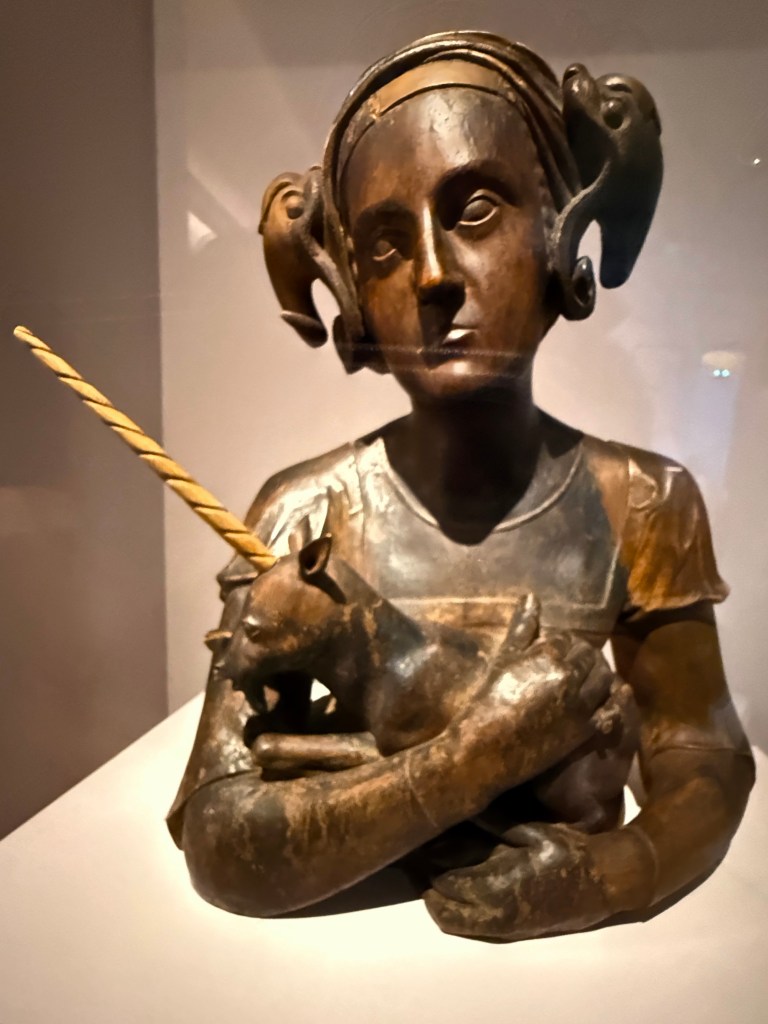 L’exposition sur les Licornes tien en quelques salles et n’est que l’ombre de celle qui a eu lieu en Allemagne. On y apprend que la Licorne est un symbole de pureté, qu’elle est à la fois une métaphore de Jésus et un symbole de courage. On y apprend que si on n’en trouve guère, c’est qu’elles n’on pas pu monter sur l’Arche de Noé. On y voit la canne de Talleyrand, faite d’une dent de narval. On voit qu’elle est universelle et hésite entre être parente de la chèvre ou du cheval.
