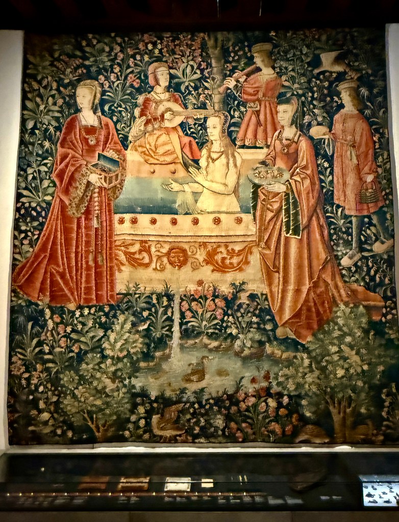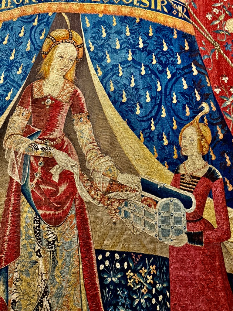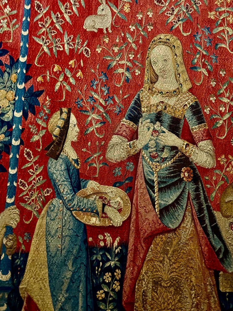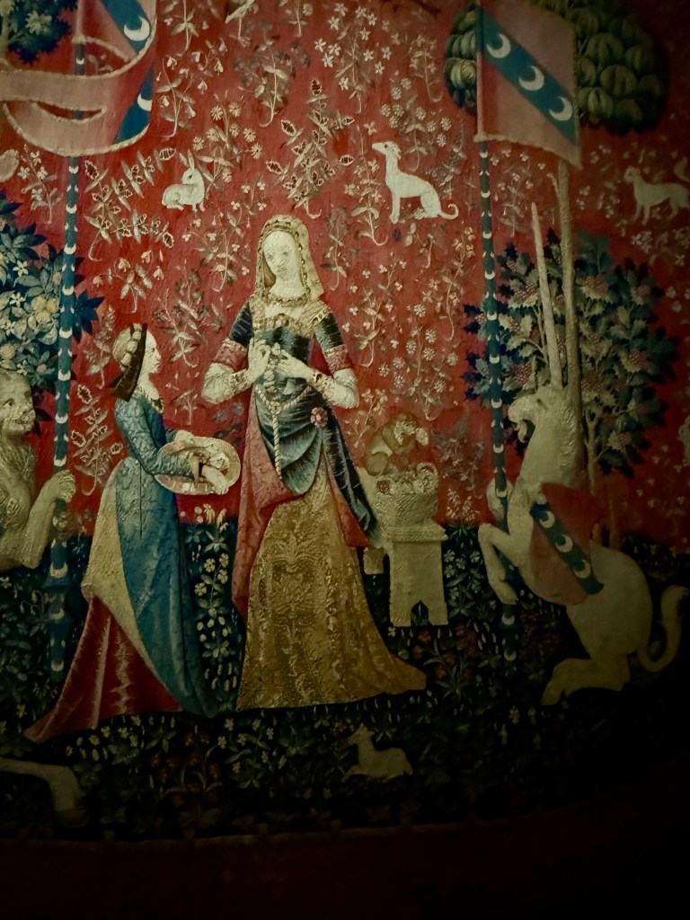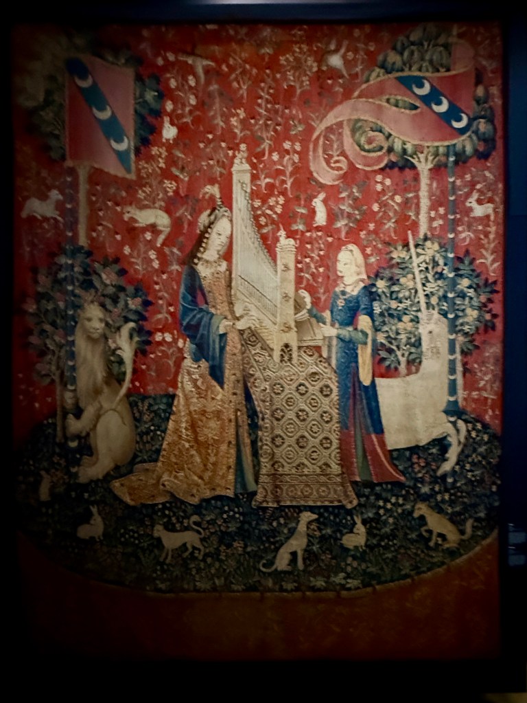Puis on visite la salle des tapisseries de la Dame à la Licorne. La véritable raison de visiter ce musée. Elles sont maintenues dans une semi obscurité car le rouge est une couleur fragile et qu’elles ont nettement pâli depuis l’âge où elles furent tissées.