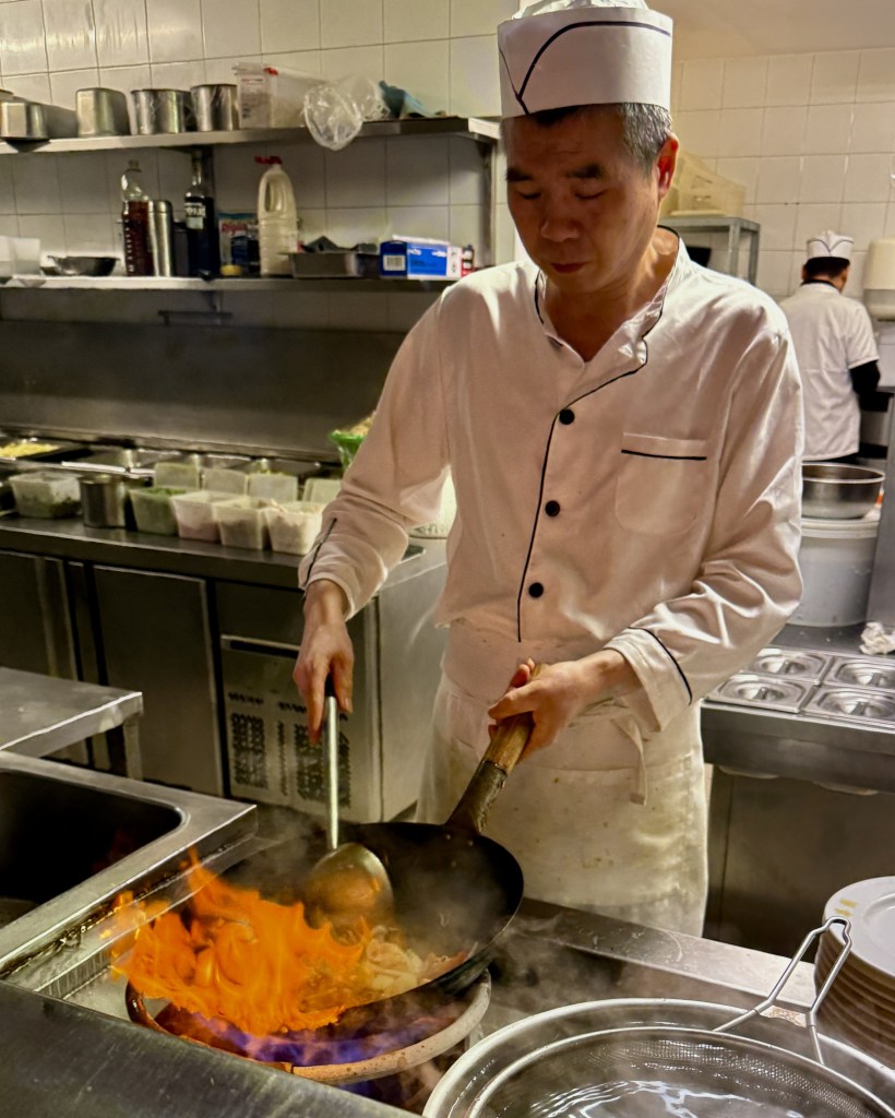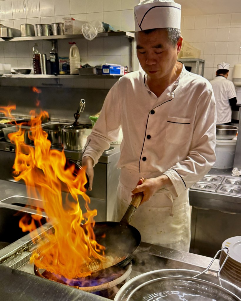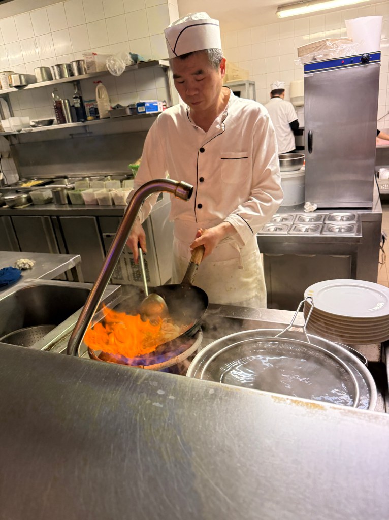Nous servons dans des assiettes creuse, d’abord les linguine, puis la crème avec la ciboulette et, enfin le saumon et les oeufs de saumon. Tout est chaud, sauf le saumon. Il ne reste plus au gastronome qu’à mélanger et se régaler.