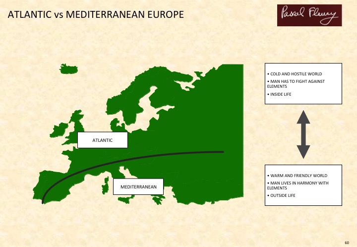 The Flemish, Basques, Catalonians, Celts, Savoyards (and these just in France) see and reinstate their regional identity as the national barriers lose their presence. Deep opposition between Atlantic and Mediterranean Europe, between Catholic and Protestant Europe, between the Europe of vegetable oils and animal fats, etc is born.