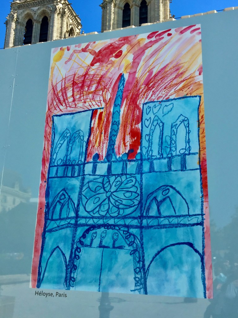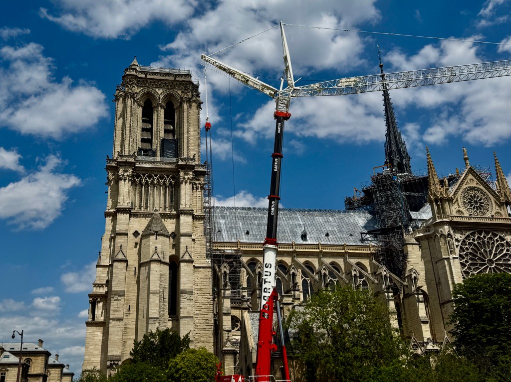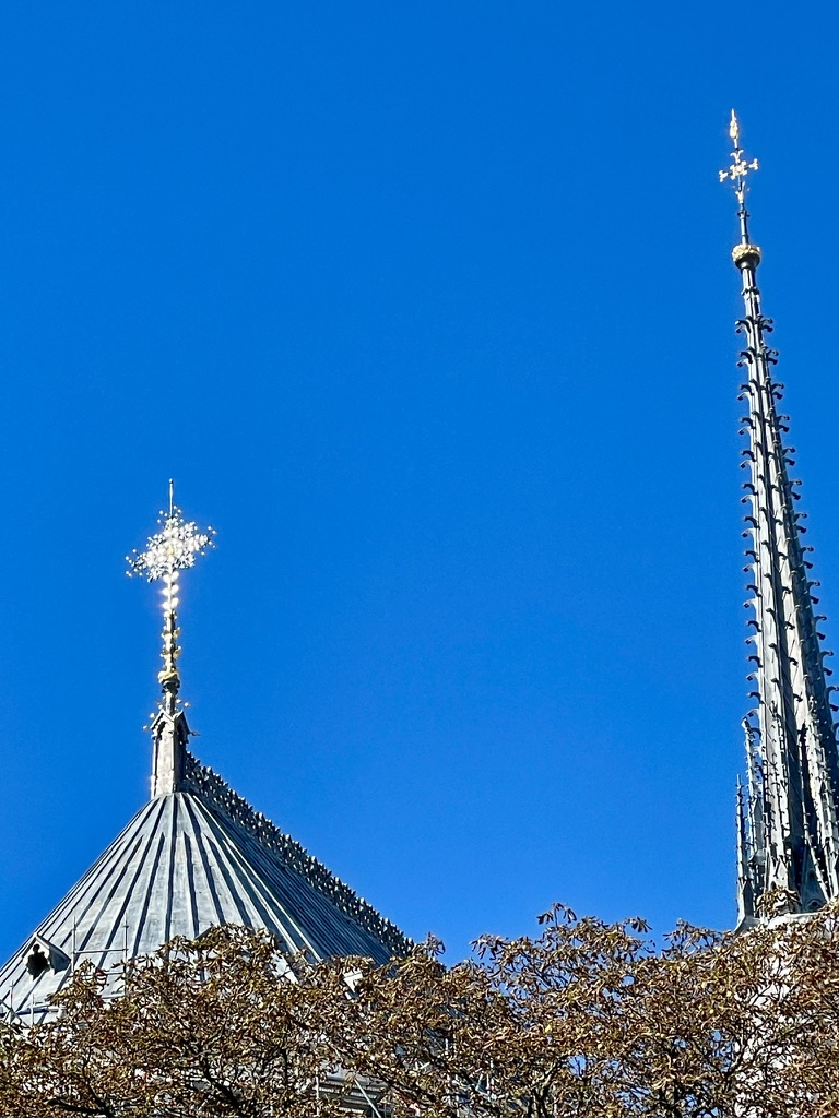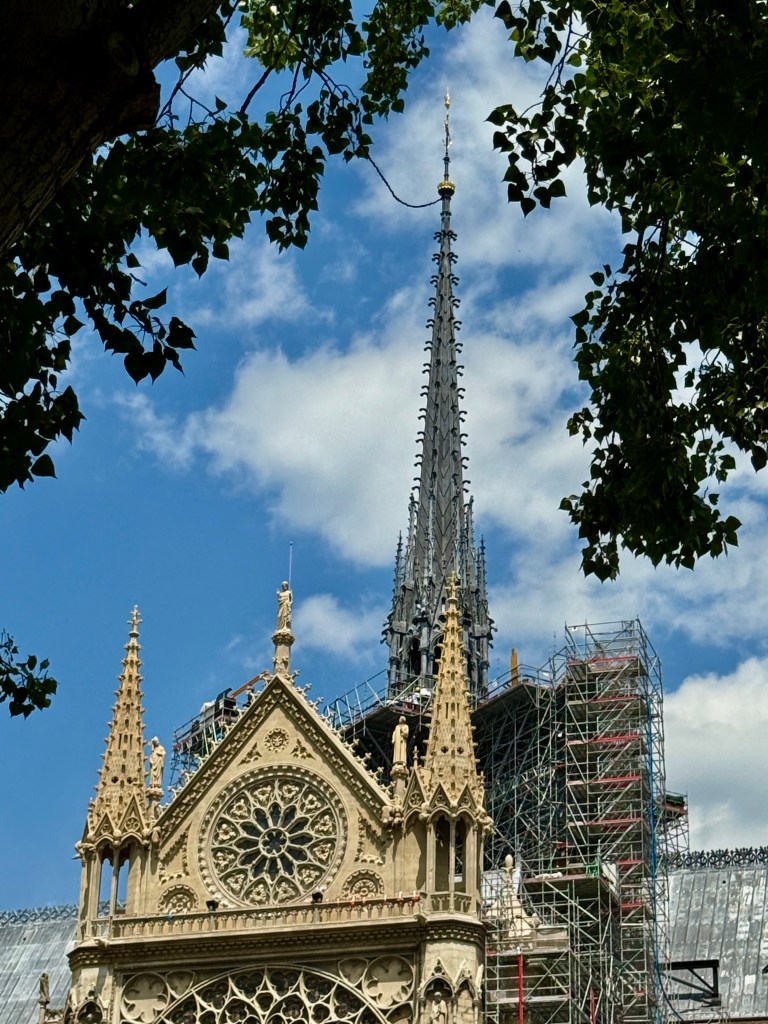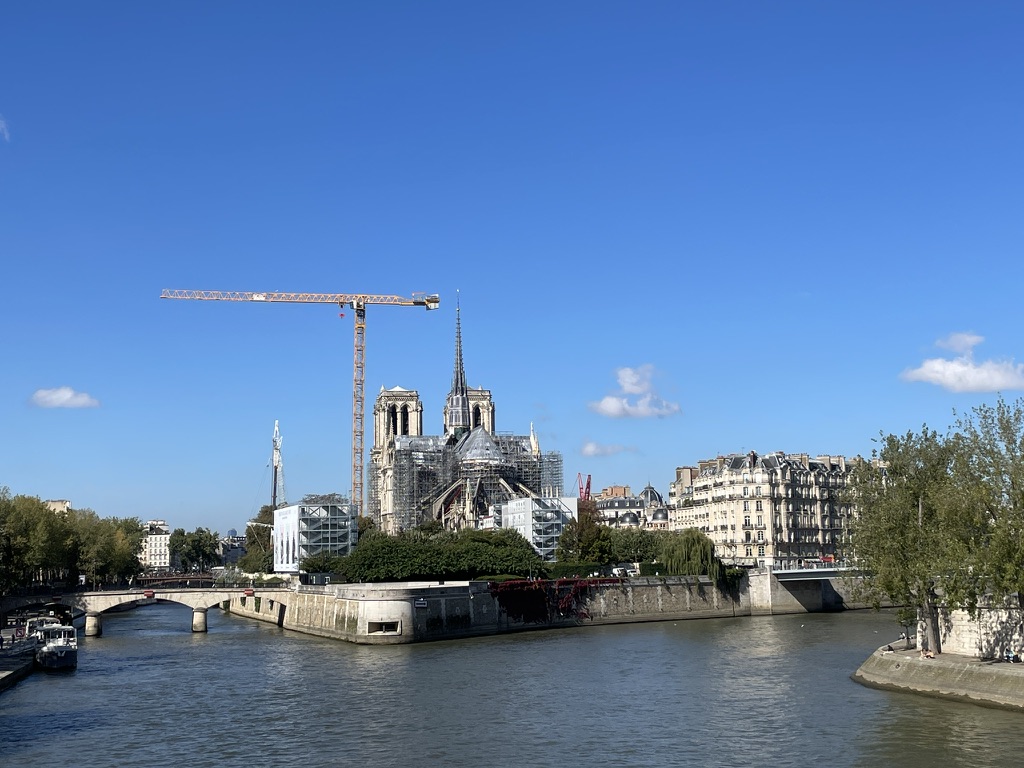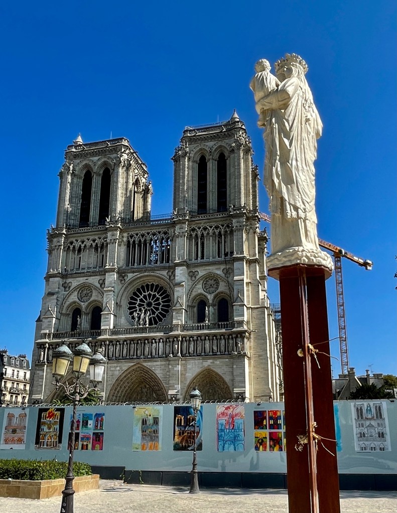 Depuis que Nôtre Dame a brûlé et qu’on a entrepris de la restaurer, elle s’est habillée d’immenses grues qui sont comme des sceptres à sa majesté. Et cela attire toute une noria de touristes qui viennent admirer cette résurrection, accompagnés de guides ou lisant les innombrables panneaux explicatifs qui la palissadent.