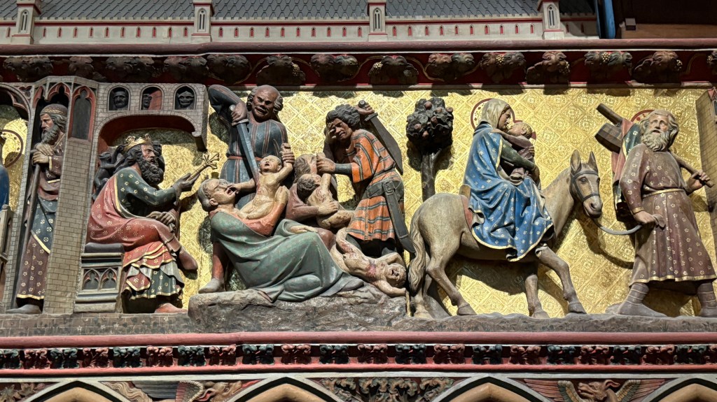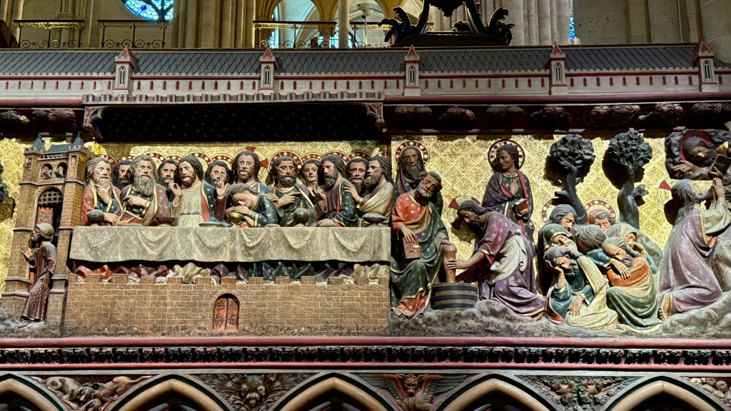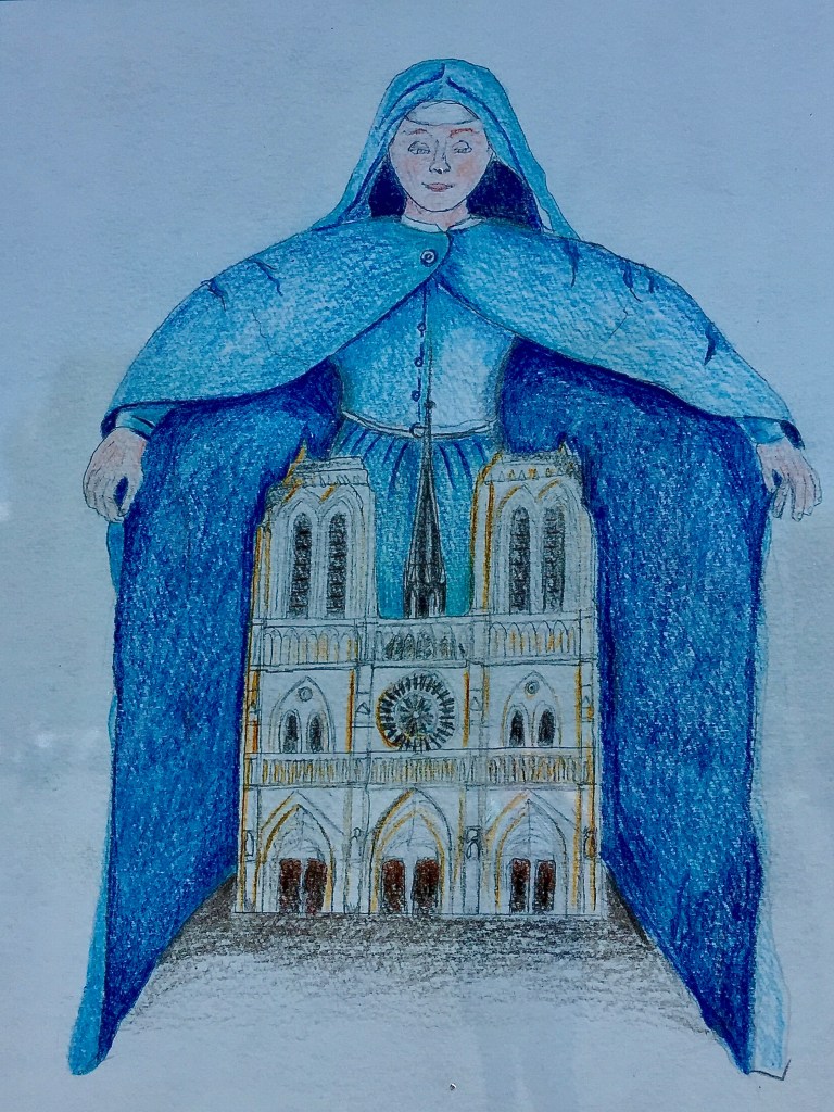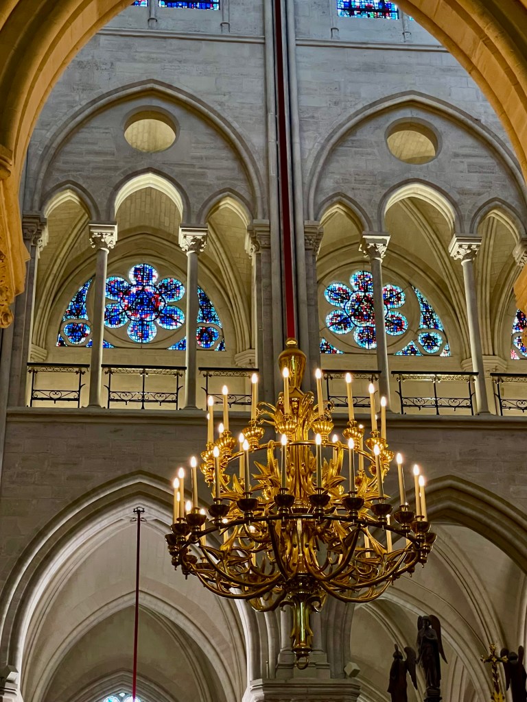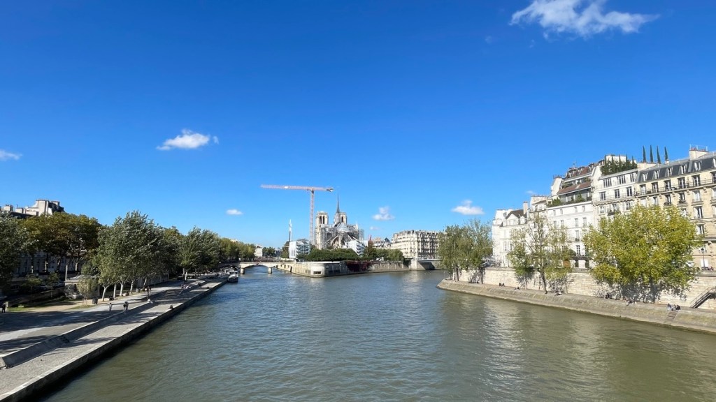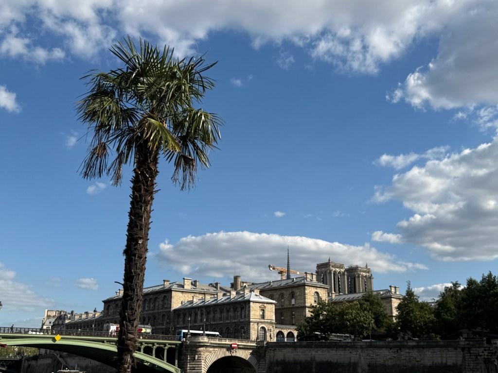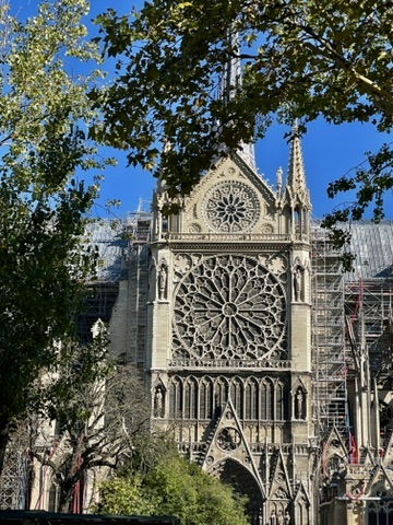Depuis que Nôtre Dame a brûlé et qu’on a entrepris de la restaurer, elle s’est habillée d’immenses grues qui sont comme des sceptres à sa majesté. Et cela attire toute une noria de touristes qui viennent admirer cette résurrection, accompagnés de guides ou lisant les innombrables panneaux explicatifs qui la palissadent.